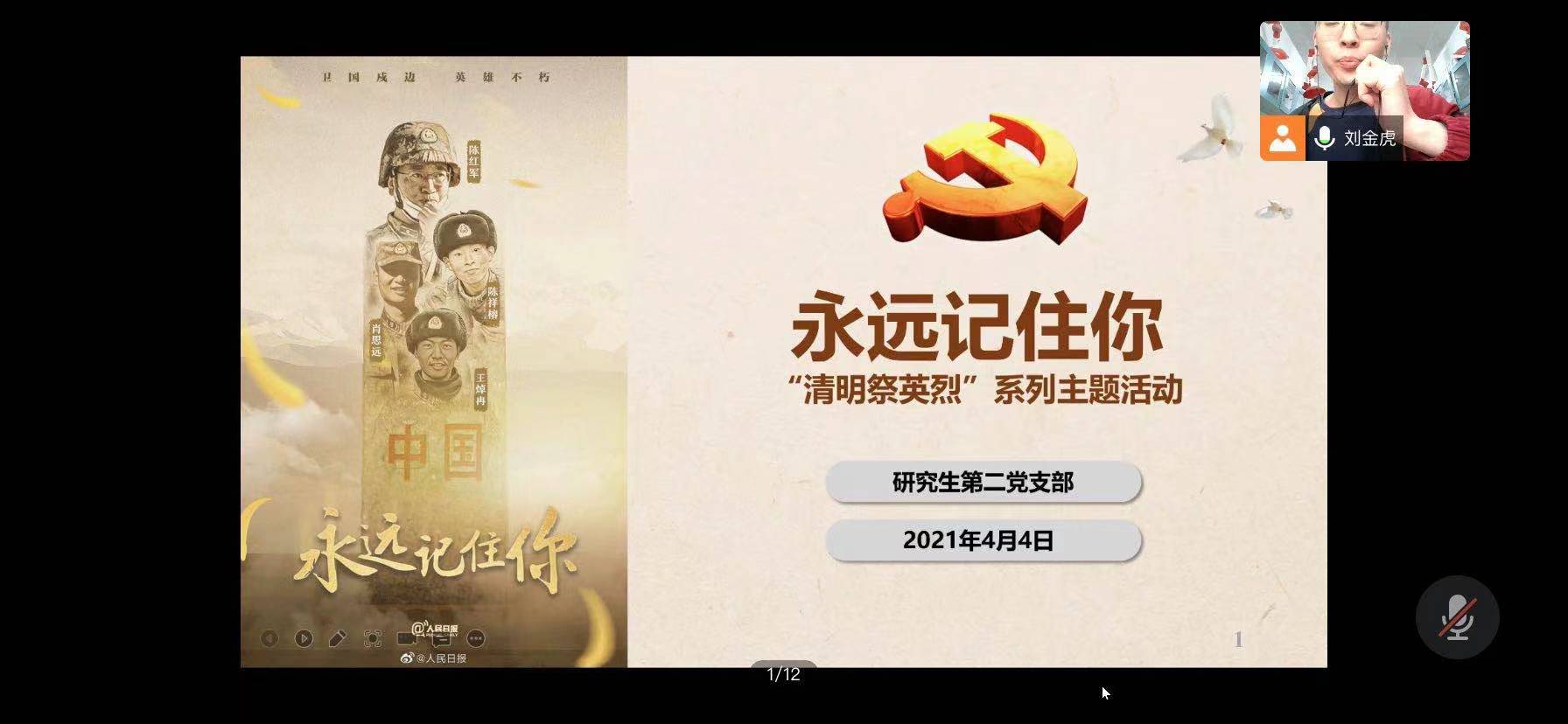 清明期间,为缅怀革命烈士,弘扬爱国主义精神,致敬建党百年征程,4月4日下午,米乐·M6(China)官方网站研究生第二党支部通过腾讯会议召开“永远记住你”清明祭英烈线上主题党日活动。会议由支部书记刘金虎同志主持,全体党员及预备党员参加会议。