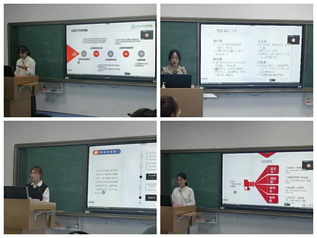 随后,各学生社团主要负责人分别进行工作汇报。山东大学学生中药协会会长李宝婵总结分析上一年社团活动中的长处与不足,并有针对性的推出新一年的社团工作计划,在部门工作、宣传方式等方面进行优化提升。山东大学学生科普协会会长周苗苗结合社团背景对活动进行了改良,详细规划了本学年的活动,并创新性地与中药协会合作共同筹备开展“药”科普系列品牌活动。米乐先锋社干事张仟钰就已开展活动进行总结反思,提出将继续开展系列药学学科特色的红色活动。