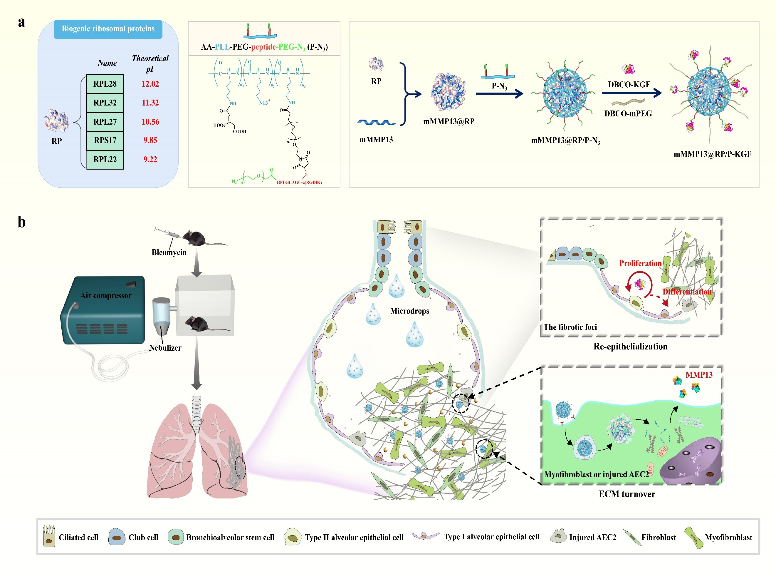 特发性肺纤维化(IPF)是一种进行性且最终致命的呼吸系统疾病,影响全球超过500万人。IPF病人肺成纤维细胞异常活化、增殖,介导肺间质基质过度沉积,肺组织过度瘢痕化,使肺泡结构遭到持续性破坏,最终致使IPF患者肺部气体交换受损甚至肺功能丧失,从而导致呼吸衰竭引起死亡。目前,肺纤维化临床治疗手段,除了肺移植术外,无论是药物治疗还是以肺康复训练为主的非药物治疗,只能减缓肺纤维化进展,不能逆转肺纤维化病灶,因此迫切需要开发新型治疗策略来修复纤维化病灶,提升患者肺功能。基质金属蛋白酶13 (MMP13)在IPF细胞外基质(ECM)重塑中起重要作用,尽管MMP13在IPF肺组织中表达增加,但由于肺内ECM大量产生和胶原溶解不平衡,随着IPF进展ECM沉积程度不断增加,导致肺纤维化程度加重。在纤维化病灶中增加MMP13可加速ECM降解,恢复肺泡空间。
