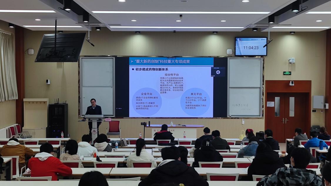 鞠建华分别从本科、硕士和博士三个阶段分享了自己求学和科研之路上的经历体验,详细介绍了中国新药研发现状、国内外演化历程对比、中国创新药物研发政策发展历程和“重大新药创制”方面的前沿进展,并以几种新药研发的经典实例,向同学们展示了药物研发和药学专业的独特魅力。活动最后,鞠建华针对同学们的问题进行了详细解答,鼓励同学们立鸿鹄之志,在学习科研道路上勤于钻研、勇攀药学高峰。