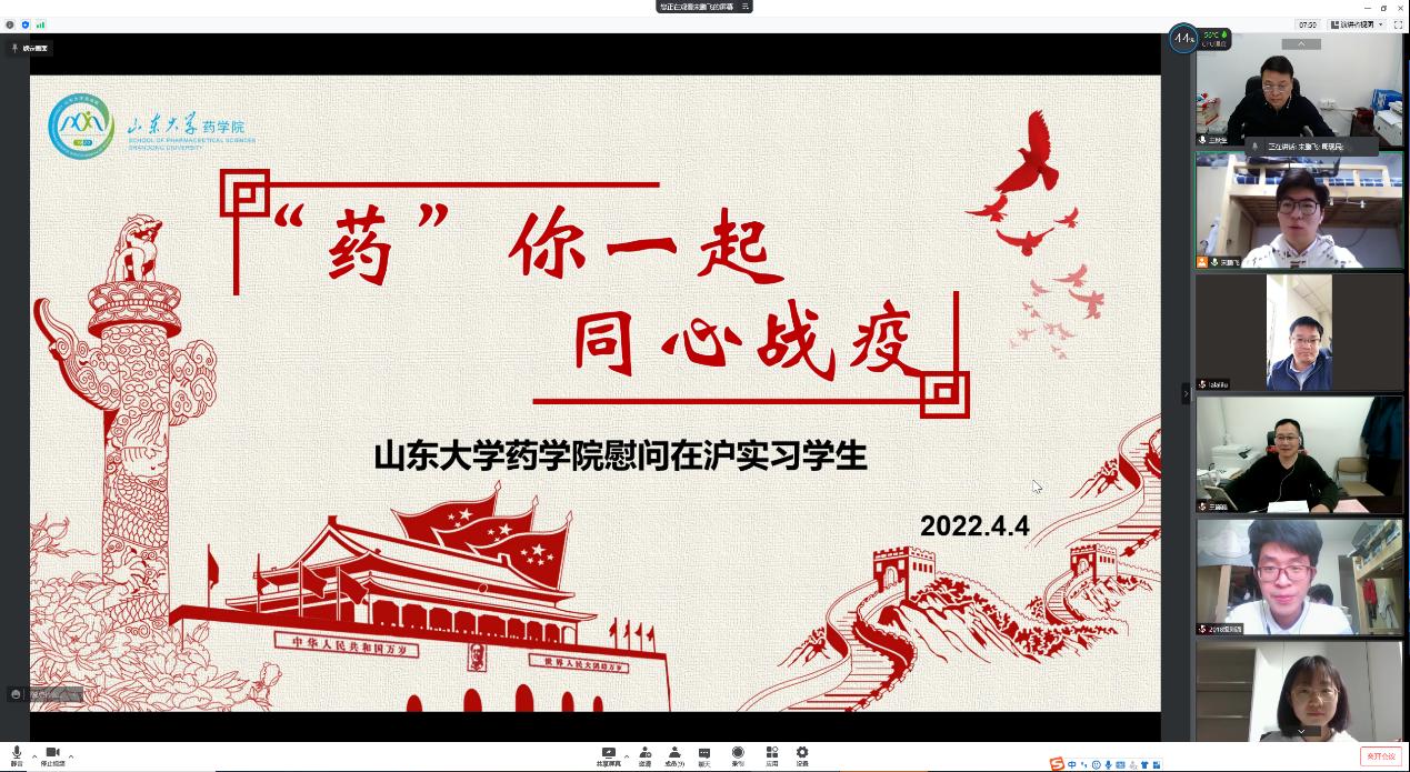 最近几天,上海疫情防控形势十分严峻。4月4日下午,学院党委书记、院长、常务副院长与在上海做毕业设计的三位推免学生视频连线,了解他们目前在上海学习和生活的情况,对他们疫情防控和学习生活给予指导,通报学校和学院目前疫情防控的情况,让他们放心、安心,将“家”的温暖和“一个都不能少”的药院温度传递给每一位学子。三位同学深受感动,表示切实体会到学院和母校是学子坚强的后盾和温馨的家,要刻苦学习、确保安全,为母校增光,希望能如期回到母校参加毕业典礼。