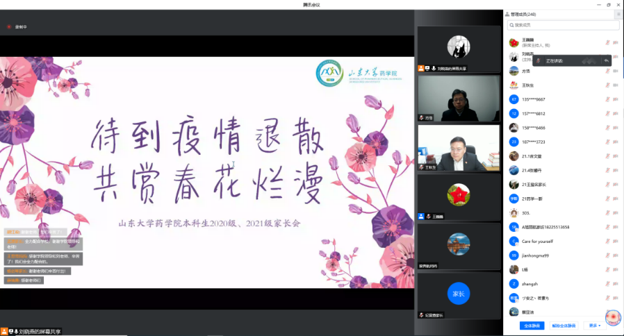 关心关爱,凝心聚力。为让家长们了解学校封闭管理期间学生们的生活状况和学习状态,让远在千里的家长们放心,米乐·M6(China)官方网站于4月2日召开以“待到阴霾退散,共赏春花烂漫”为主题的本科生大一大二年级线上家长会。学院党委书记、常务副院长和副书记出席,向家长们介绍了当前校园疫情防控的严峻形势、面临的问题挑战、学校疫情防控的管理保障措施、学院线上教学工作的组织安排和学生线上上课情况,学校领导、校区领导和学院领导老师驻扎在办公室,和同学们生活工作在一起,让家长们放心安心。同时呼吁家长积极配合学校,做好学生的思想工作,架起家校协同防控、协同育人的桥梁,共同为学生们构筑安全屏障,促进药学学子健康成长成才。