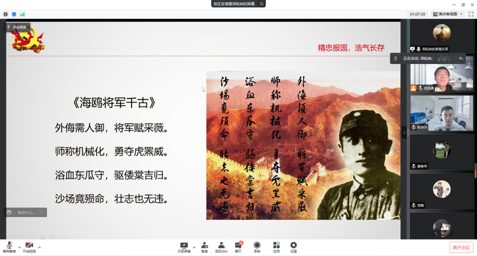 在重温习近平总书记讲述过的抗战英雄故事环节,双方支部十位党员分享了赵尚志、杨靖宇、左权、彭雪枫、邓玉芬、赵登禹、张自忠、戴安澜、“狼牙山五壮士”、“白刃格斗英雄连”等英雄事迹。本次分享活动使同志们更加充分地了解了革命先辈们开展武装斗争的革命史,感悟了革命烈士前仆后继、可歌可泣的英勇精神,进而从历史中汲取前行的力量。党员同志们纷纷表示,要珍惜来之不易的胜利成果,学习先辈们为创造新中国无私无畏的英雄气概,踏着他们的足迹,奋勇前行,担当实干。