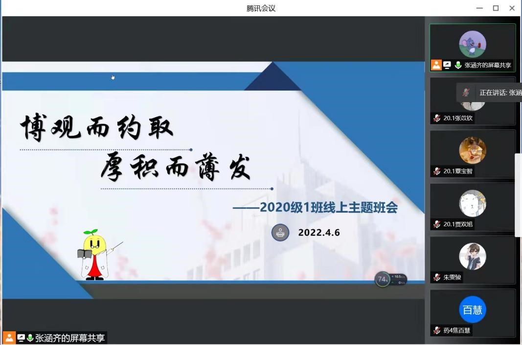 近日,2020级药学1班通过腾讯会议举办“博观而约取,厚积而薄发”主题云班会。副院长沈涛、班主任刘秀美和辅导员刘晓燕出席会议,会议由班长张涵齐主持。