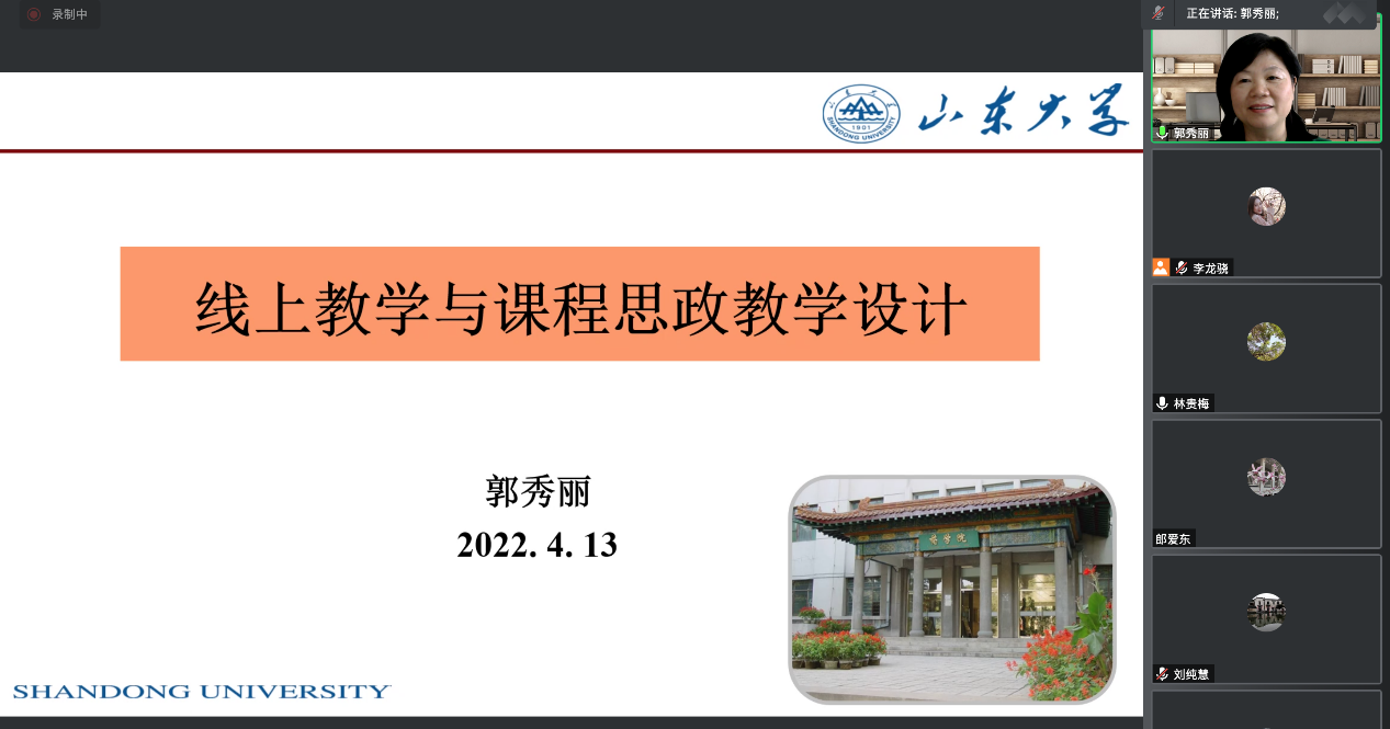 郭秀丽教授以《线上教学与课程思政教学设计》为主题,结合她作为校级督导员的督导经验,分享督导关键点,详细解读了山大特色课堂教学评价标准,随后结合《药理学》教育部课程思政示范课程的建设,分享了课程思政教学实践的理念与实践。