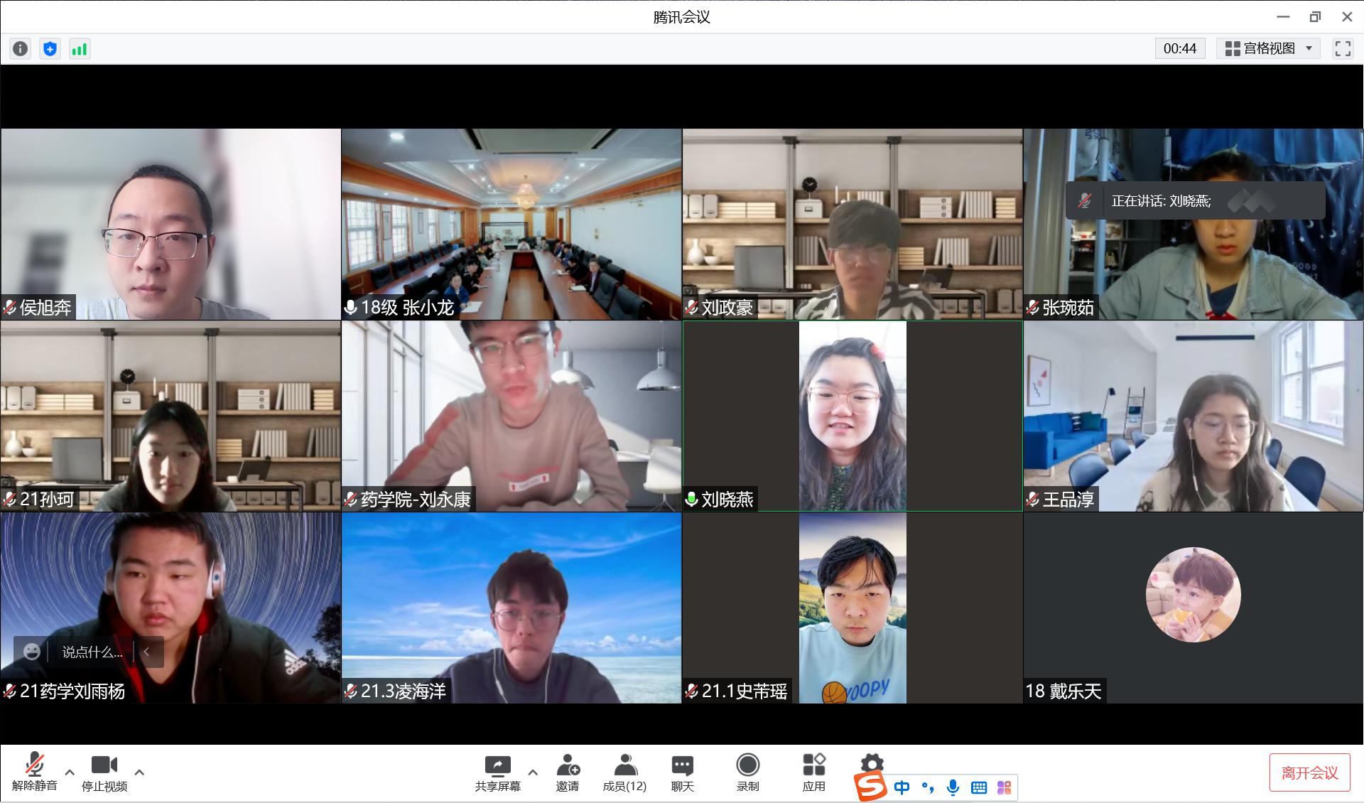 侯旭奔根据2020级和2021级同学提出的共性问题,请本科导师团队的2018级同学和2019级同学分享保研、考研、大学生创新和科研体验等方面的经验与体会。2018级孙玉桐、陈梦、戴乐天、张小龙四位同学分别交流了推荐免试协和药物所,考研浙江大学、中山大学和本校的经验,鼓励学弟学妹珍惜青春时光、提前规划、刻苦学习,充分发挥我校本科大学生创新与科研体验的优势,全面提升个人素质。2019级高树、张子孺两位同学分享在本科导师团队科研室学习经历,建议2020级同学在大学创新活动中一定亲自动手、不惧失败、增强团队合作意识。随后,2020级同学和2021级同学就大学四年的人生规划、大学生创新立项要求、基础课与专业课学习等内容,通过线上和线下的方式请高年级同学解疑释惑。