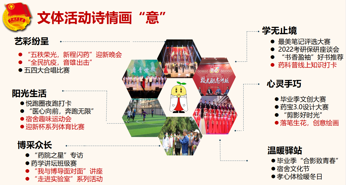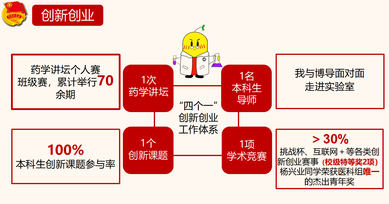 以“四个一”创新创业工作体系为核心,开展“药学讲坛”“我与博导面对面”等特色活动。本科生创新课题参与率继续保持100%。以“一院一品”建设为抓手,培育药学讲坛、艺术节、健身月、修身课堂、校友励志讲坛等精品活动,营造学文健体、严于修身的良好氛围。