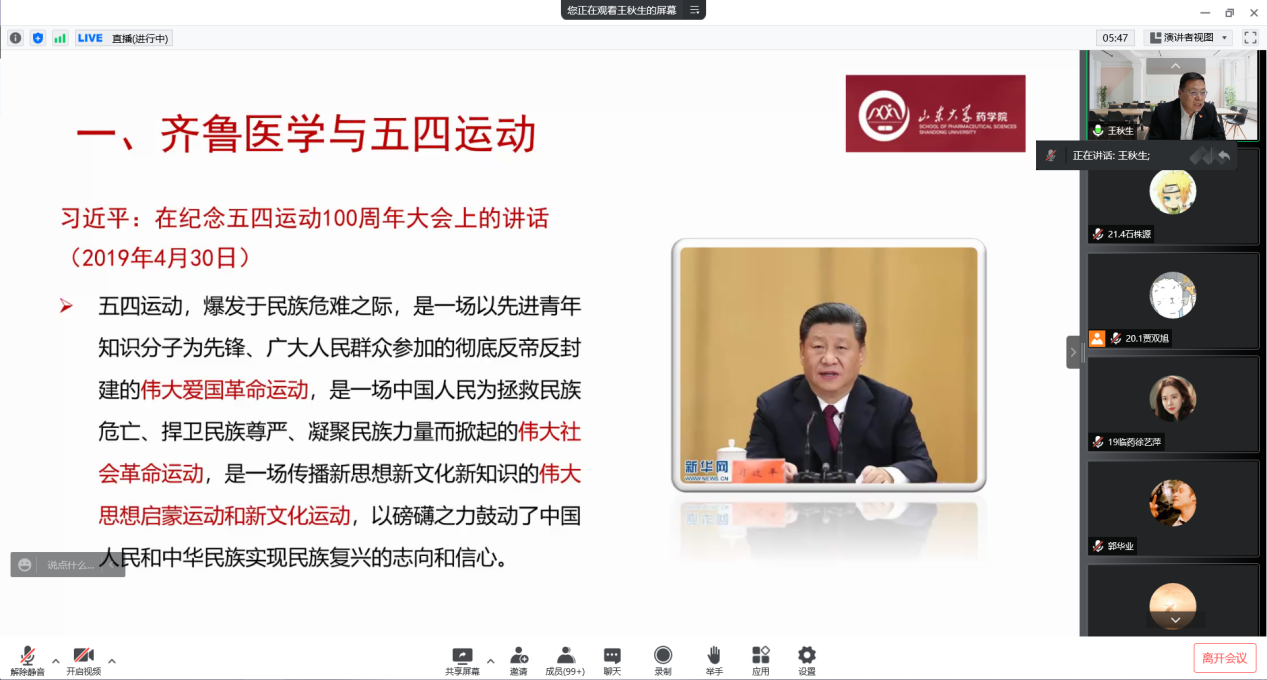 王秋生结合齐鲁医学与五四运动的历史,带领同学们学习齐鲁医学前辈先贤波澜壮阔的反帝爱国斗争历史,重温齐鲁医学青年伟大的家国情怀,让“爱国、进步、民主、科学”的五四精神深入同学们心中,教育引导同学们要树立伟大理想、热爱伟大祖国、担当时代责任、勇于砥砺奋斗、练就过硬本领、锤炼品德修养。重点强调青年人之于国家、之于时代的重要性,责任与荣耀同在,要求同学们不负韶华,不负党和人民的殷切期望,不负习近平总书记对青年们的期望。