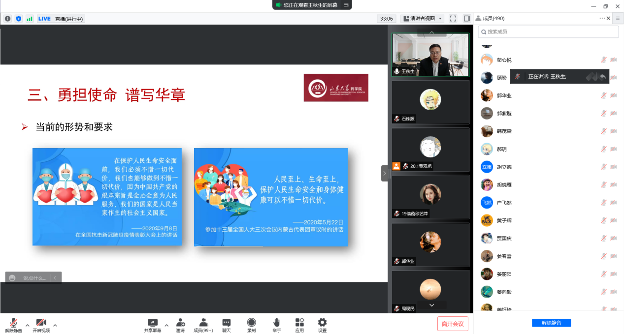 王秋生以具体事例向同学们讲述了山东大学教职医务员工在疫情防控期间为保障同学们正常学习生活所做出的努力和无私奉献精神,强调当前学校实行的所有疫情防控举措都是为了保障每一个人的生命健康安全和正常学习生活,要求全体同学时刻与国家疫情防控政策保持一致,与学校和学院的具体工作要求保持一致,坚定依靠党的正确领导和各级政府的强力支持,不畏艰巨挑战,在齐心协力,同心战“疫”伟大实践中不断成长进步。