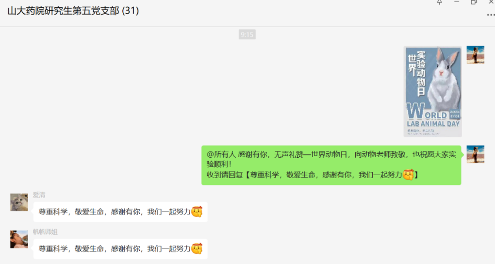 “感谢有你,无言礼赞”,4月24日为世界动物日,五支部注意到封控的校园内不仅有师生,还有实验室的大量动物,针对封控下的动物防疫管理和关爱工作,党员们以身作则,通过支部党员微信群、微信朋友圈等途径积极宣传“尊重科学,敬爱生命”理念,分享动物防疫的小常识,充分体现了疫情无情人有情,隔离病毒不隔爱的责任担当。
