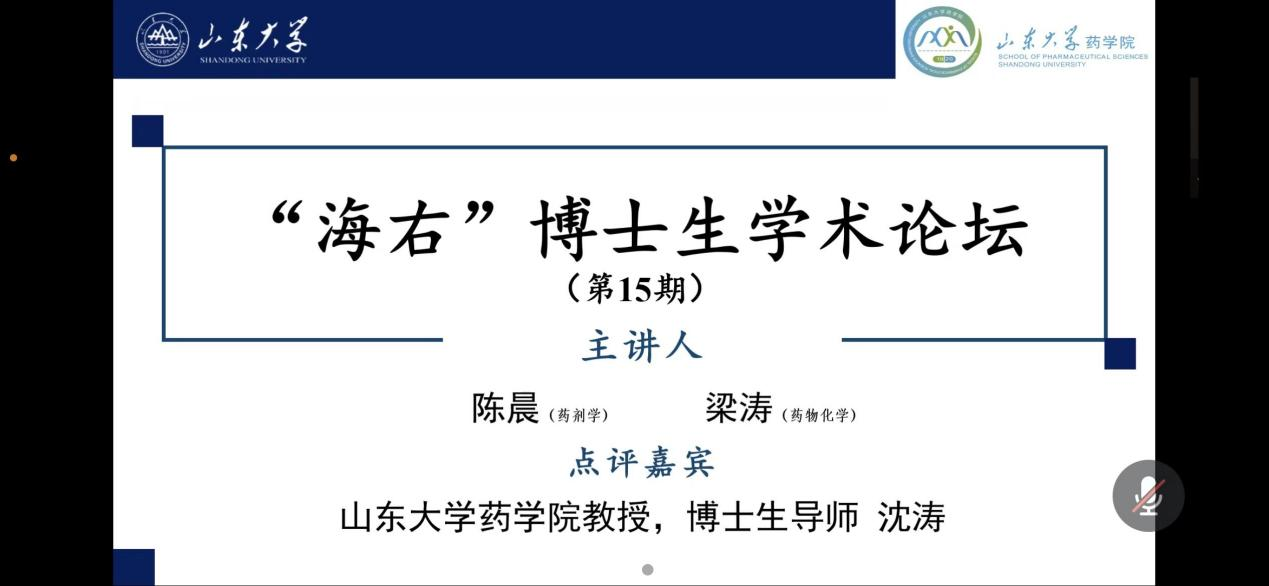 2022年6月9日,由山东大学研究生院、党委研究生工作部主办,米乐·M6(China)官方网站承办的2022年第15期(总第778期)“海右”博士生学术论坛通过腾讯会议平台举行。本次论坛属于优秀博士毕业生毕业报告月活动,米乐·M6(China)官方网站2018级药剂学博士研究生陈晨和2019级药物化学博士研究生梁涛受邀作报告,米乐·M6(China)官方网站2021级硕士研究生傅姝萌担任主持人,博士生导师沈涛教授作为点评嘉宾出席本次论坛。