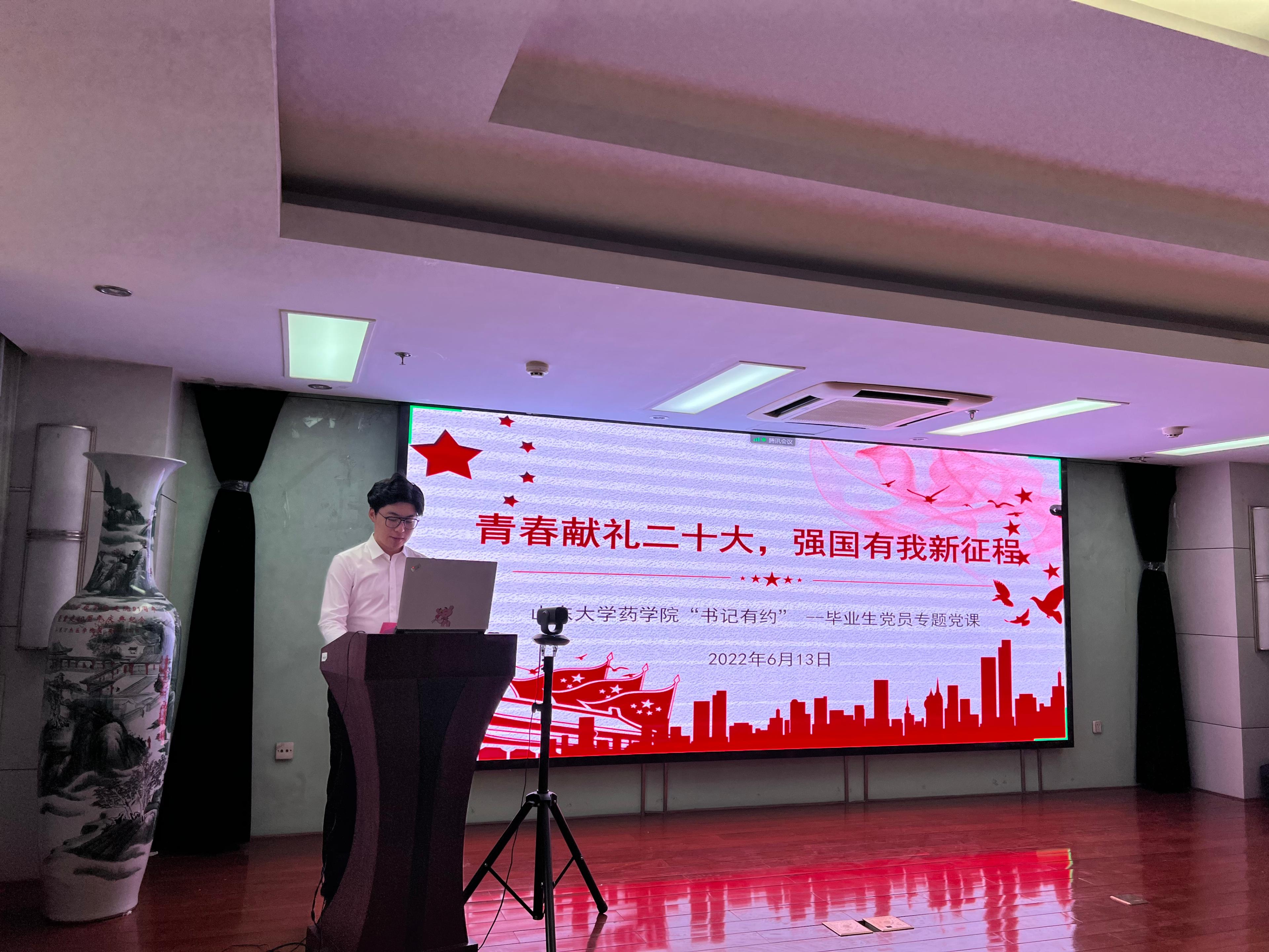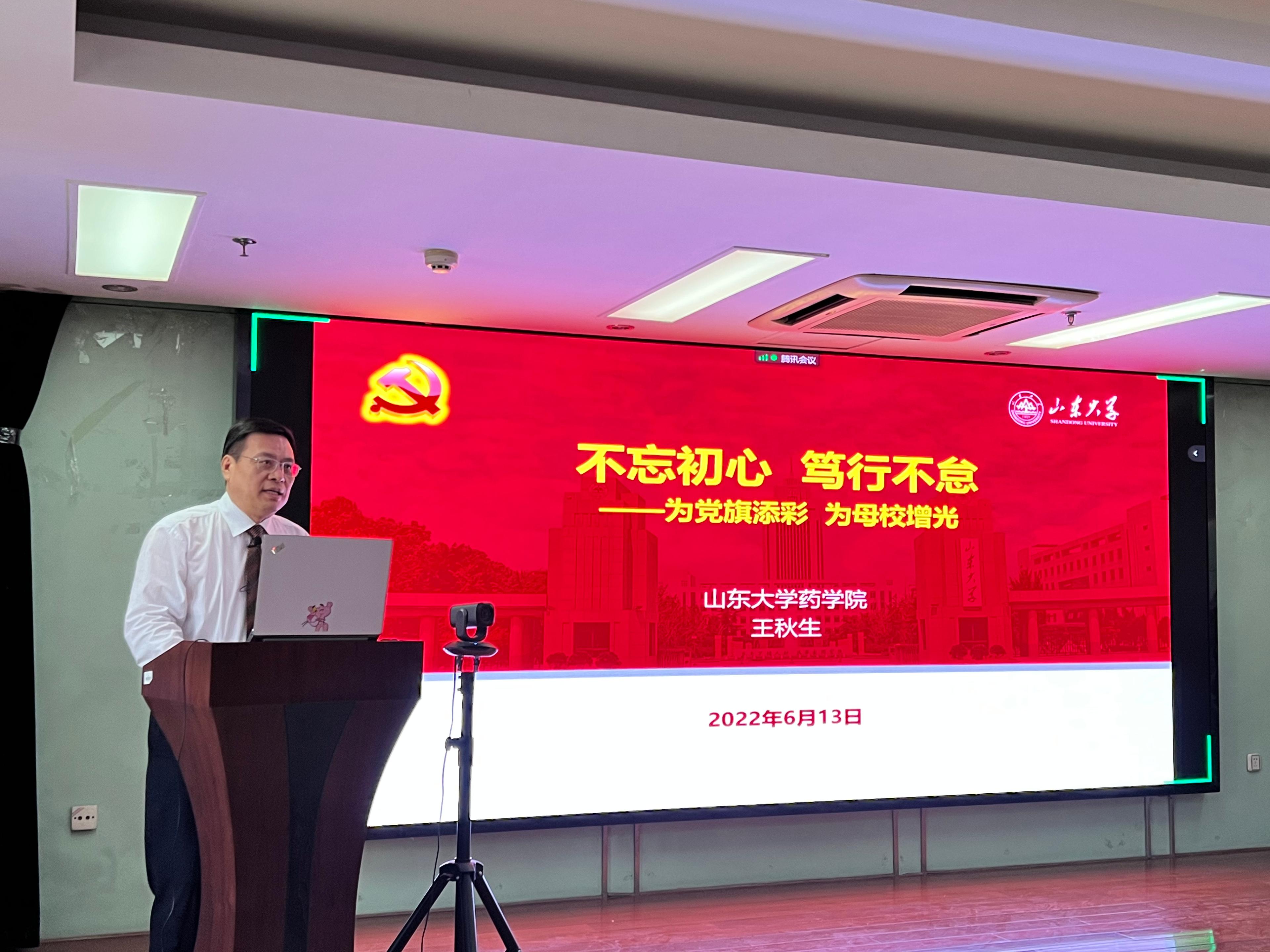 王秋生为全体毕业生党员作“不忘初心,笃行不怠—为党旗添彩,为母校增光”2022届毕业生专题党课,讲述了中国共产党发展历程中的代表性事件,深化了毕业生党员们对党史的认识,希望毕业生党员们体会中国共产党人精神谱系,坚定理想信念,为党旗添彩;向毕业生党员们讲述山东大学校史和米乐院史的红色基因传承,希望毕业生党员们知校荣校,牢记山大人、医学人的初心,努力增强自身专业本领,为祖国药学事业贡献力量,书写精彩人生,为母校增光。
