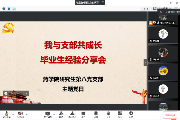 毕业起航,我与支部共成长。正值毕业季,为充分发挥优秀毕业生的朋辈互助作用,支部组织了毕业生经验分享会。五名优秀毕业生代表从自己的亲身经历出发,向大家分享了宝贵经验。郑丹丹从求职定位、材料准备、招聘信息来源等环节介绍了自己的求职经验。马文青给大家分享了公务员、事业编备考的心得。杜倩和闫会仙也从药企求职、考公考编等方面给大家提出了宝贵意见。邱胜男结合自己博士申请的经历,从择校、备考、报名等环节介绍了自己的经验。毕业生分享的宝贵经验使支部党员深受启发,从而进一步完善自己的学业和职业生涯规划。支部对党员教育管理的过程,也是提高党支部凝聚力、战斗力和影响力的过程。支部以“喜迎党的二十大”为契机,梳理支部发展历程,共同拍摄主题视频“我与支部共成长”,引领支部战斗堡垒作用再升级。