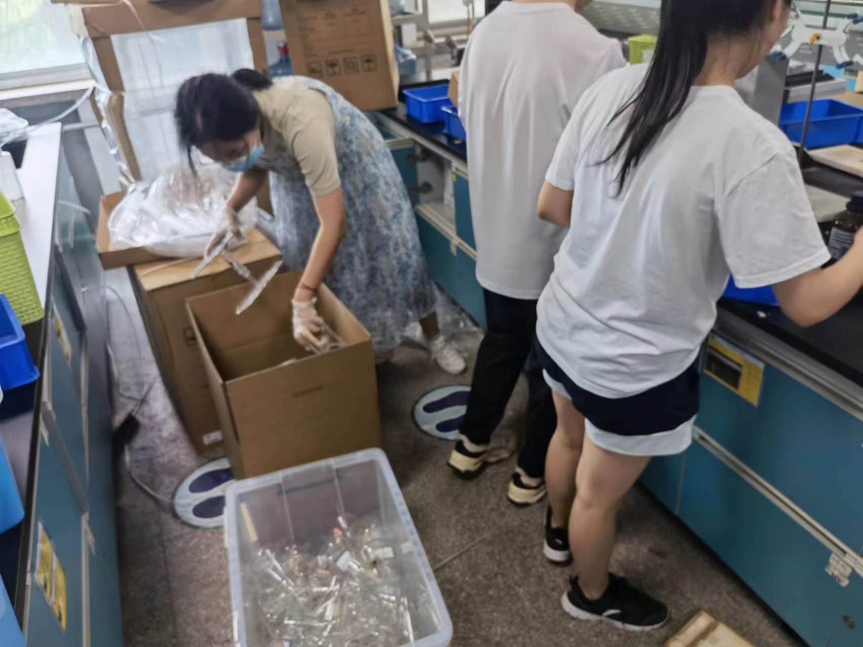 6月22日,米乐·M6(China)官方网站7号楼药物分析教学实验室搬迁,各实验室药物试剂装箱打包任务繁重,仅靠平台几位老师难以在规定时间内完成搬迁任务。学院党委号召党员先锋力量加入搬迁工作,在党委号召和各学生党支部积极响应下,迅速集结34名党员和积极分子加入到搬迁队伍。下午2:30,志愿者们冒着烈日到达搬迁地点,简单分工后即投入装箱打包整理工作。整理工作繁重,且有可能接触化学试剂,同学们以高度的责任心和专业性,高效完成。过程中很多同学磨坏了四五副手套,也有的同学不小心磕到受了轻微伤,但大家任劳任怨。当老师询问时,一名党员说:没事老师,志愿服务本来就辛苦也是应该的,只希望能尽一己之力得到认可就好!