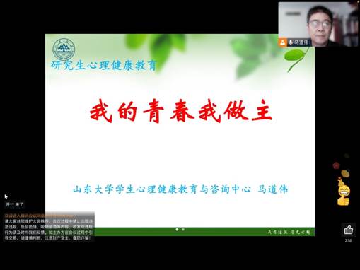 学生心理健康教育与咨询中心副主任马道伟以“我的青春我做主”为题,围绕压力、情绪、亲密关系、导师关系四个方面与新生进行交流,分享压力调解技巧,以正确的心态应对环境压力,帮助新生做好情绪管理,保持良好的心态,顺利完成研究生阶段的学习,不断提升与发展自己。