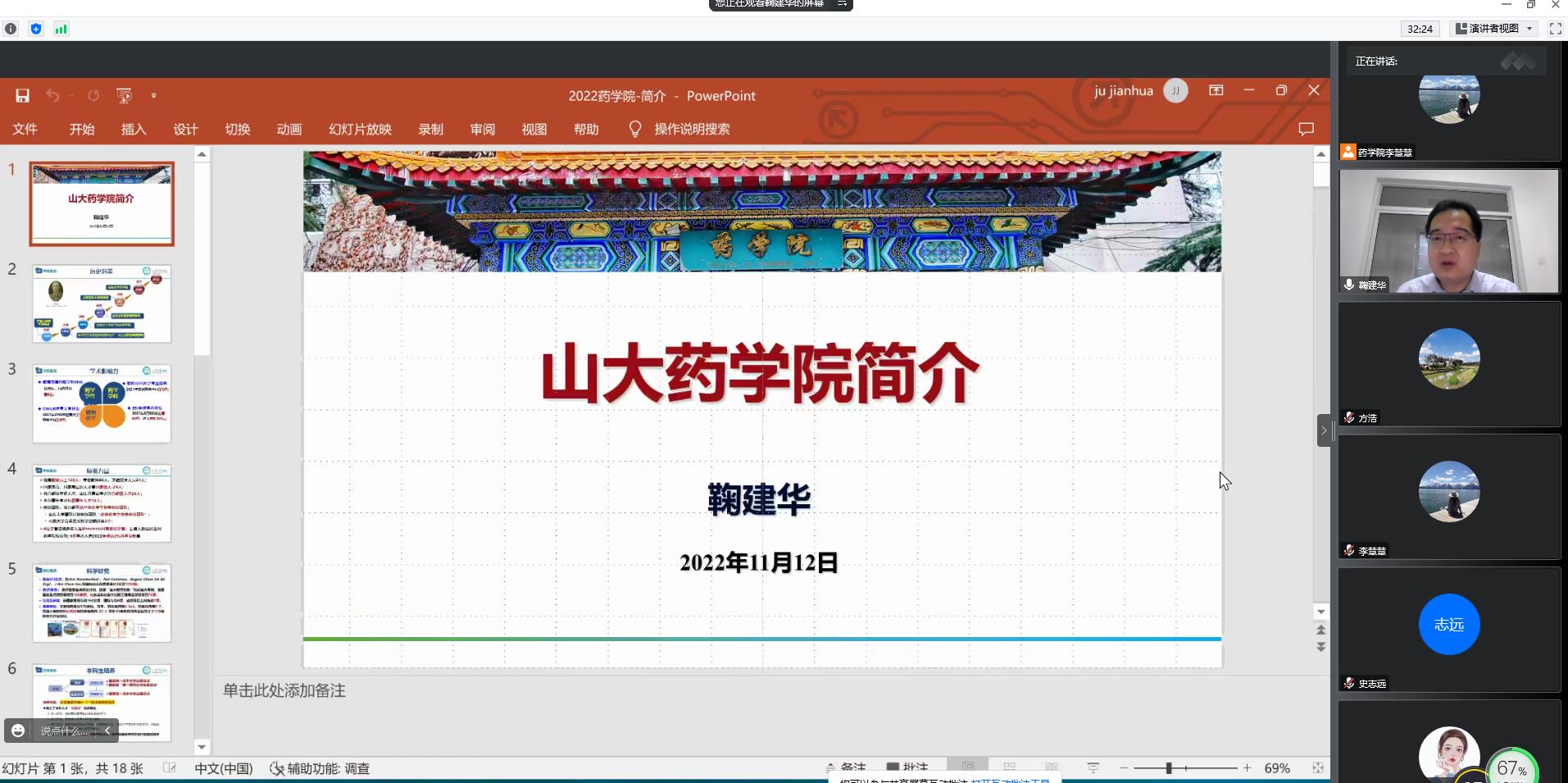 院长鞠建华对受邀参会的7位海内外青年人才表示诚挚欢迎,他介绍了米乐·M6(China)官方网站整体发展情况,从历史沿革、师资队伍、学生培养、科学研究、平台建设、合作交流、建设举措等方面介绍了学院情况及未来发展规划。下一步,米乐·M6(China)官方网站将针对药学前沿基础、基于临床价值导向的创新药物、现代中药等进行布局,打造创新药物研发和成果转化平台,为青年人才加盟山东大学未来事业发展奠定良好的基础。