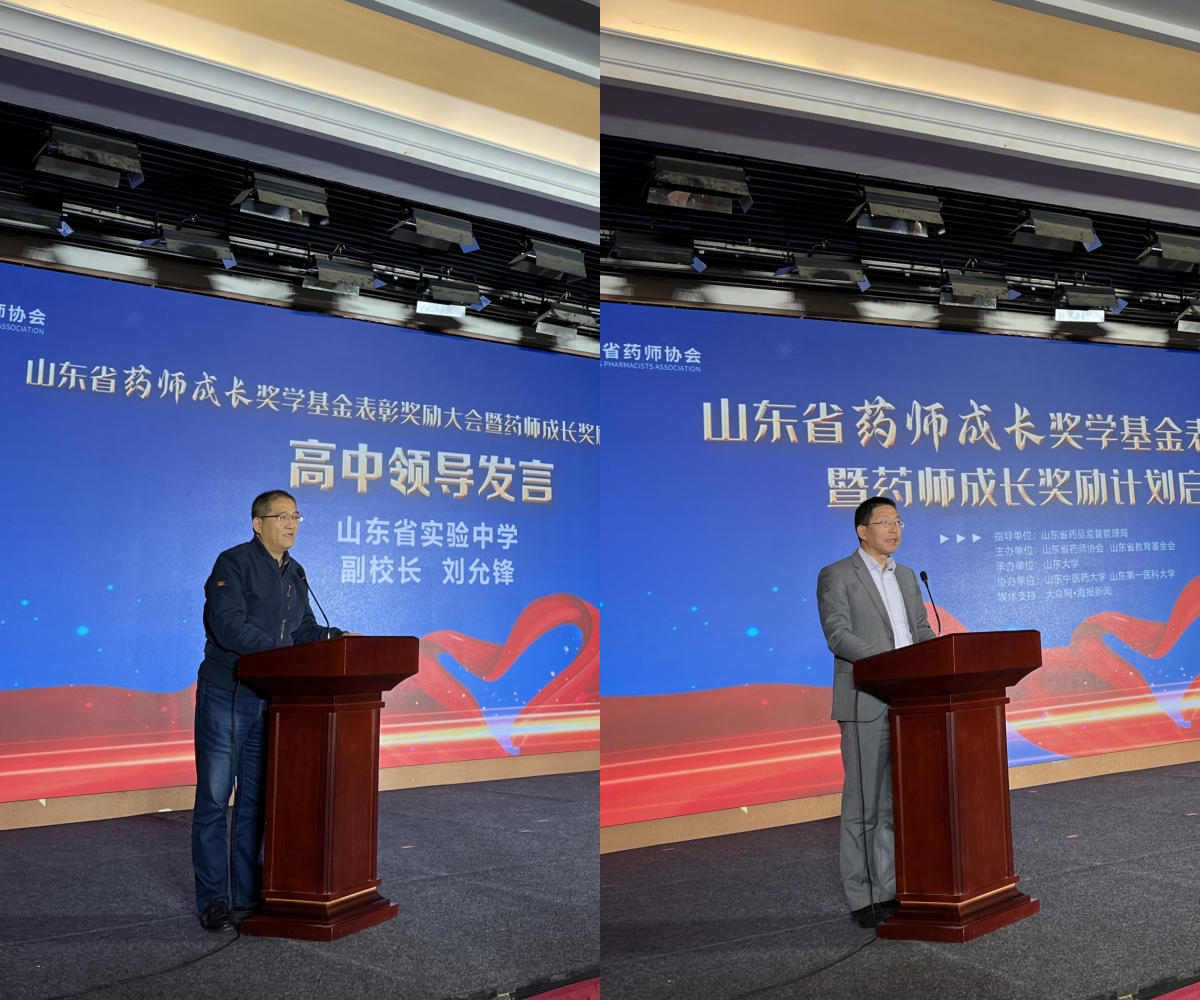 山东省实验中学副校长刘允锋、历城第二中学副校长李矿水分别发言。刘允锋表示,学校将积极参与药师成长奖励计划,为学生发展创造空间和机会,为高校选拔人才、培养人才助力。李矿水表示,学校愿引导更多优秀学生投身药学事业,加入药师队伍,为中国药学事业发展贡献力量。