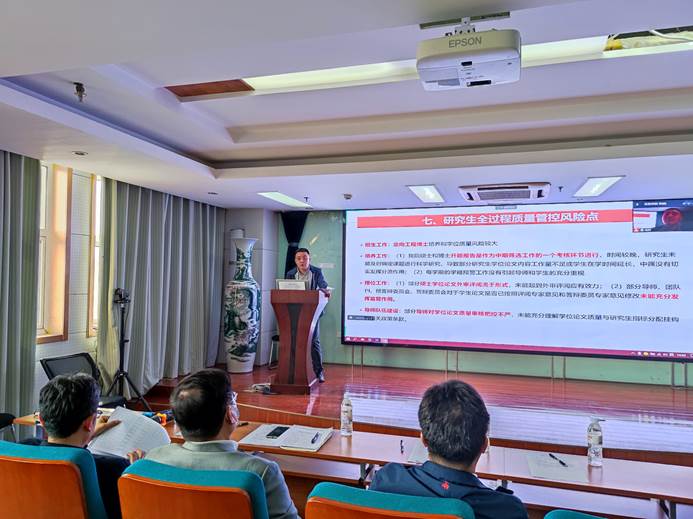 沈涛为研究生导师解读了学院关于提升学位论文质量的工作方案,对重点任务和工作流程进行了梳理,重点分析了研究生招生、中期考核、预答辩等关键节点的潜在风险,针对性地介绍了工作思路、改进措施和预期目标。