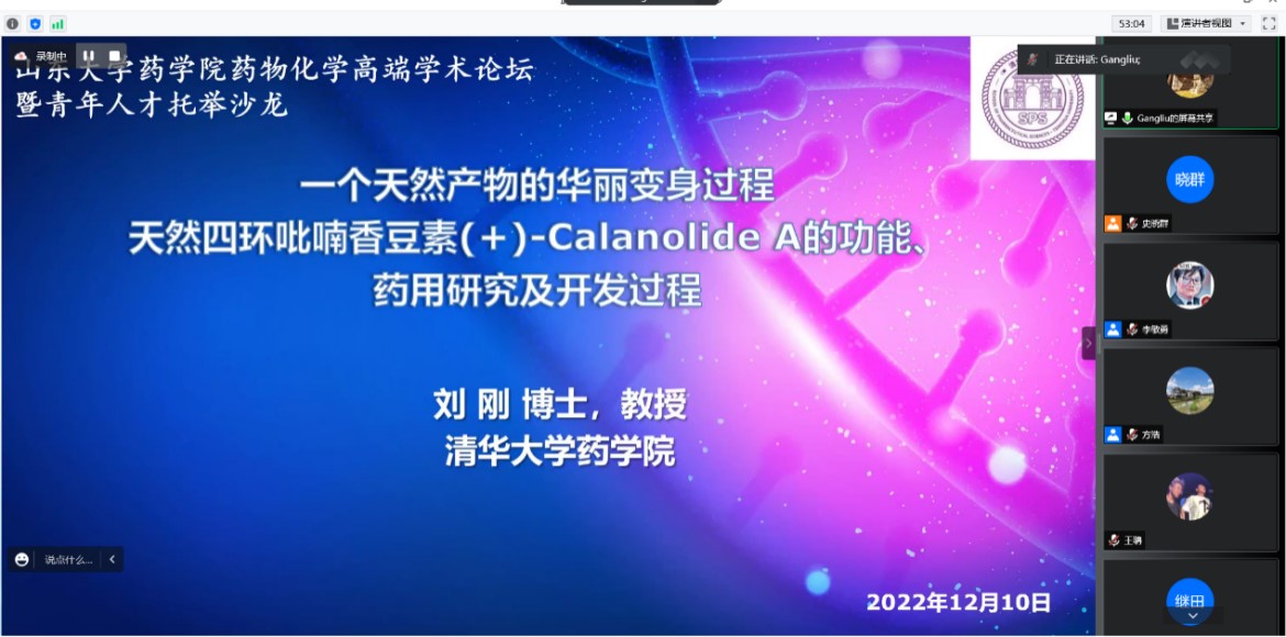 七位专家分别以《一个天然产物的华丽变身过程:天然四环吡喃香豆素(+)-Calanolide A的功能、药用研究及开发过程》《天然药物的工业全合成》《可见光促进的非蛋白源氨基酸合成及多肽化学修饰》《手性分子高效构建及应用》《构建知识图谱,探索近药空间》《术中可视化浸润性肿瘤分子边界导航实体瘤切除》《未靶蛋白质功能干预研究》为题,聚焦新药源头创新和药物核心关键技术、基础研究与应用研究领域的最新研究成果,为现场师生奉献了一场学术的饕餮盛宴。七位专家的报告深入浅出,研究内容反映药学相关领域的发展趋势和前沿动向,具有重要的研究意义和社会价值,引发了师生们的浓厚兴趣。与会人员围绕报告内容与七位专家展开了热烈讨论和深入交流。