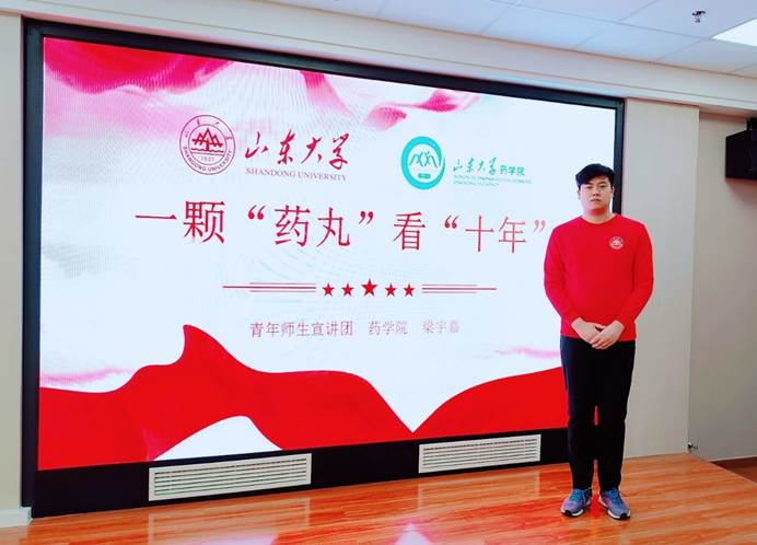 宣讲围绕着一颗“药丸”的故事展开。梁宇嘉从药学视角讲述了十年来的伟大成就,展望未来“健康中国”美好蓝图,并详细讲述了“璀璨十年:生物医药取得重大成果”“未来领航:崭新百年赓续更大辉煌”“山大力量:追随精神再振齐鲁荣光”三大部分,同时对党的二十大报告中医药卫生相关表述进行解读。