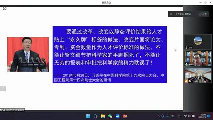 院长鞠建华结合党的二十大报告中关于教育、科技、人才的有关论述,以及习近平总书记关于人才工作的重要论述,强调学院要注重人才梯队引进和分类培养,科学规划教学课程体系,优化科研组织模式,优化绩效分配制度,构建良好的创新文化和生态。