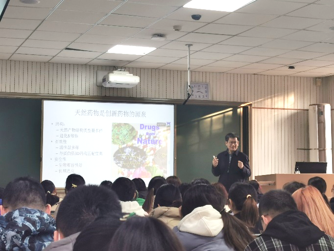 国家卫健委“十四五”规划教材《天然药物化学》主编娄红祥教授走进了天然药物化学国家一流课程的第一堂课,他为同学们带来了裸盖菇碱、青蒿素、阿司匹林、可卡因、吗啡、毒芹碱、山羊豆碱等天然药物的研究故事,生动地讲解了天然药物研究在新药发现中的重要作用。在回溯研究历史的同时,他还介绍了每种药物的最新研究进展,有的是本月刚刚发表的研究论文里的发现,以此激发同学们不断深入探索和造福人类的热情。通过这些精彩的故事,他阐述了天然药物化学的研究内容、发展历史、学科地位和研究方法。他联系吗啡的历史讲述了鸦片战争对我国近代史的影响,联系吗啡生物合成的新成果讲述了药品监管的与时俱进,联系青蒿素讲述了屠呦呦和魏振兴等老一辈科学家为青蒿素的发现和产业化所作的贡献,联系当下时髦的ChatGPT讲述了人工智能在新药研发中的应用,联系我国科学家研究论文的统计数据讲述了我国在全球天然药物研究领域的领先地位,激发了同学们爱国、守法、敬业、奉献的精神和为我国药学事业奋斗的决心。
