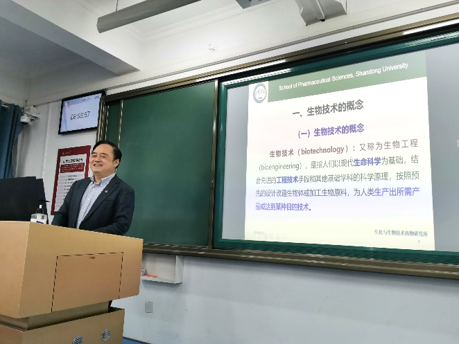 国家卫健委“十四五”规划教材《生物技术制药》主编王凤山教授在新学期第一课中,带领2021级药学本科生踏入了学习生物技术制药的大门。他联系生物技术的发展,向同学们介绍了生物技术的概念和发展,结合大量实例和图片介绍了基因工程、细胞工程、发酵工程和酶工程的概念,以及在抗体工程、糖链工程、蛋白质工程和海洋生物技术方面的最新进展。在此基础上,引导同学们认识生物技术在制药中的应用,以及生物技术制药的主要研究内容与任务。在授课中,他将国内外最新进展以及其实验室的研究成果介绍给同学们,使同学们着迷于现代生物技术的魅力。最后,他寄语同学们踏实学习、乐观向上,争取成为我国生物技术制药领域的栋梁。