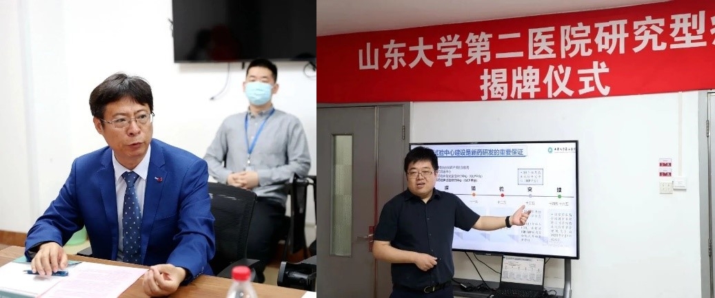 曹森、冯世庆、王秋生、鞠建华、赵小刚、赵维共同为研究型病房揭牌。第二医院临床科室主任代表王成伟、陈诗鸿,临床药理科主任刘志芳,临床试验机构办公室主任于金龙,研究型病房副护士长李红彦,相关职能部门负责人,药学部其他人员参加活动。