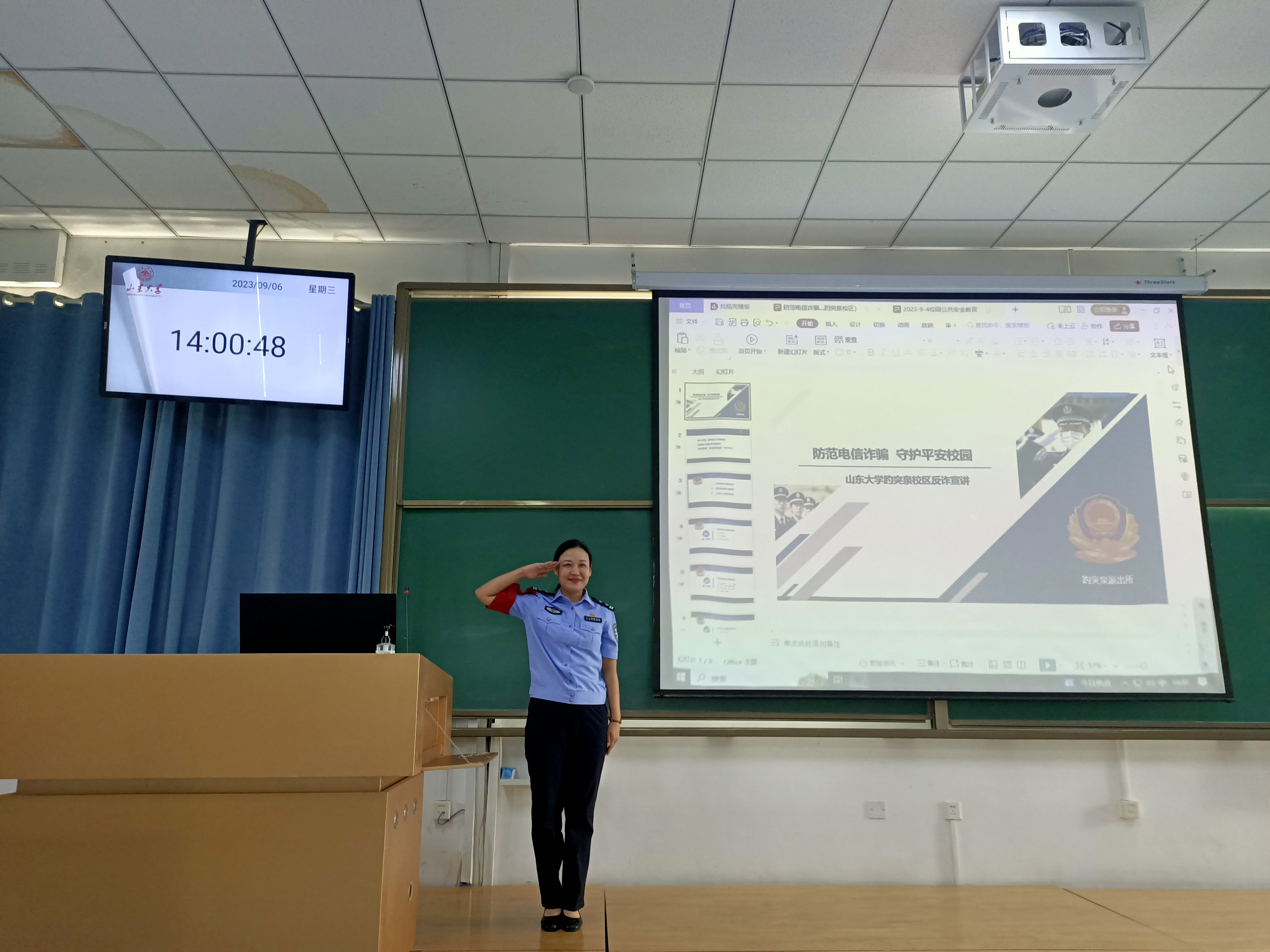 9月6日下午,为增强学生的防诈骗意识,学院邀请趵突泉派出所副所长王俐和趵突泉校区保卫部谢峰老师开展预防诈骗及校园安全教育主题讲座。王俐讲述了目前诈骗的主要形式,介绍了诈骗操作体系,提醒同学们提高防范意识。谢峰从消防安全、交通安全、治安安全三个方面强调了校园公共安全的重要性,特别强调出行时遵守交通规则。