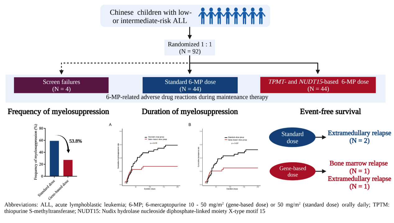 急性淋巴细胞白血病(ALL)是最为常见的儿童血液恶性肿瘤。6-巯基嘌呤(6-MP)是儿童ALL治疗方案的基石药物,尽管6-MP在ALL中具有公认的疗效,但在临床实践中发现中国ALL儿童患者6-MP的血液毒性发生率明显高于高加索人。基于“临床导向-临床评价-精准治疗”的儿童用药研发与应用的理念,赵维教授团队和转化医学与创新药物国家重点实验室合作共同开发了儿童白血病个体化治疗基因芯片。在此基础上,通过前瞻性临床研究发现中国儿童中NUDT15基因高突变率与6-MP的血液毒性密切相关。进一步,赵维教授团队与中国医学科学院血液病医院(中国医学科学院血液学研究所)、山东大学齐鲁医院、青岛大学附属医院、山东第一医科大学附属第一医院和河北省儿童医院通过多中心随机对照试验首次证实,在中国ALL儿童中基于NUDT15基因型调整6-MP初始剂量,可有效减少6-MP血液毒性的发生。该研究为推进儿童白血病个体化治疗基因芯片的临床应用提供了理论与数据支持。