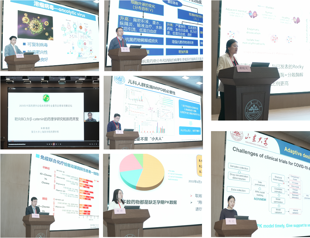 论坛第二部分着眼于基于新靶点的药物研发与模型引导的新药研发(MIDD)及个体化精准治疗。暨南大学张海鹏教授、北京大学第一医院庞晓丛副研究员、复旦大学朱棣教授、中南大学湘雅三院裴奇教授、复旦大学朱校研究员、上海交通大学医学院附属胸科医院王琛瑀主管药师、山东大学郑义副教授、北京大学第三医院宋玲助理研究员分别作题为“溶瘤病毒类药物的靶向机制及联合用药”、“前列腺癌基质微环境研究及靶向药物发现”、“靶向BCL9/β-catenin的药理学机制研究和新药发现”、“模型和TDM助力重症感染患者抗菌药物治疗”、“定量药理学在儿科抗感染精准用药中的应用”、“基于定量系统药理学在非小细胞肺癌患者中PD-L1联合化疗的给药方案研究”、“模型引导的抗新冠药物临床研究”、“模型引导的孕妇精准用药与新药开发研究与思考”的报告。各位专家从各自研究领域出发,聚焦学科前沿,为广大师生奉献了一场学术盛宴。