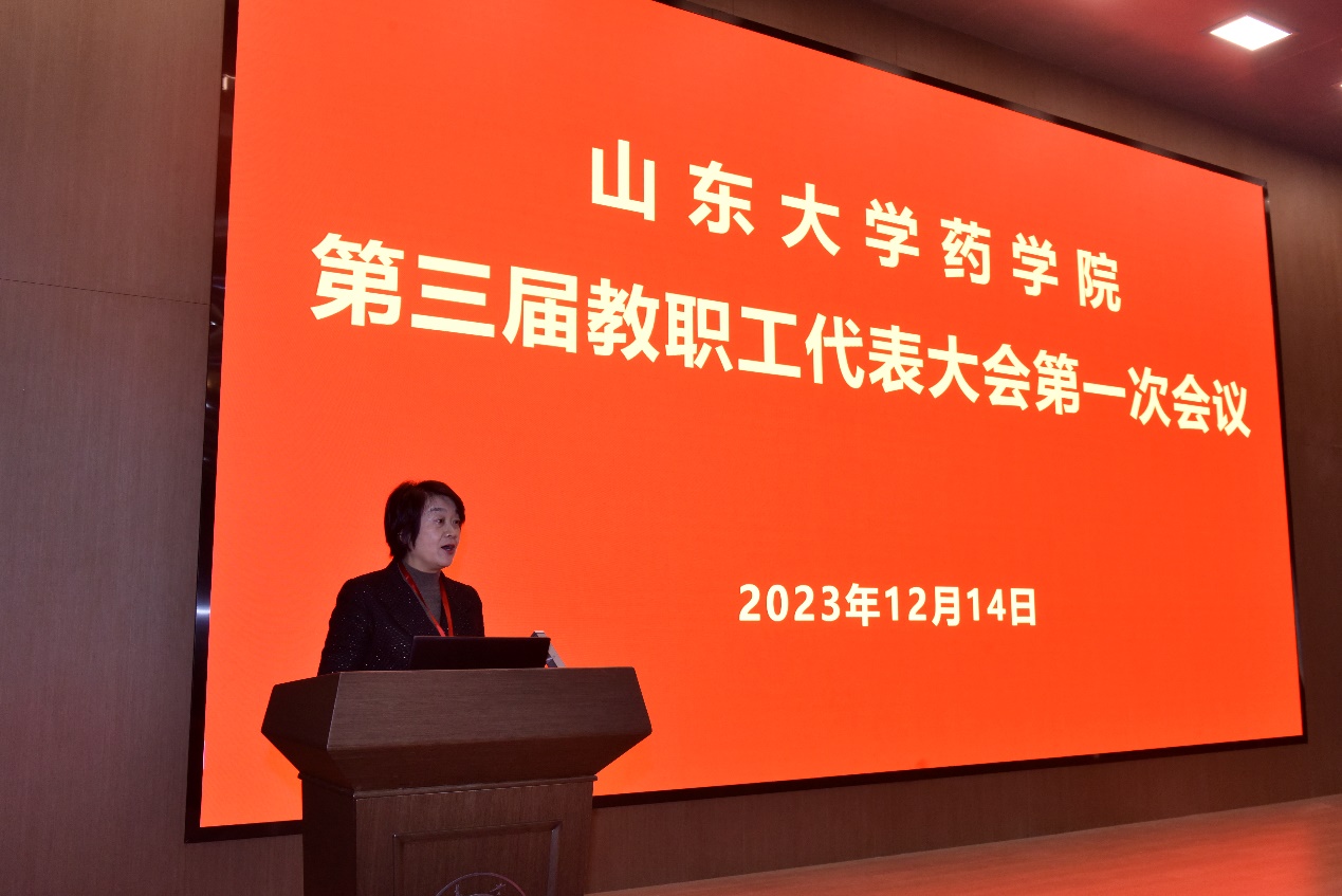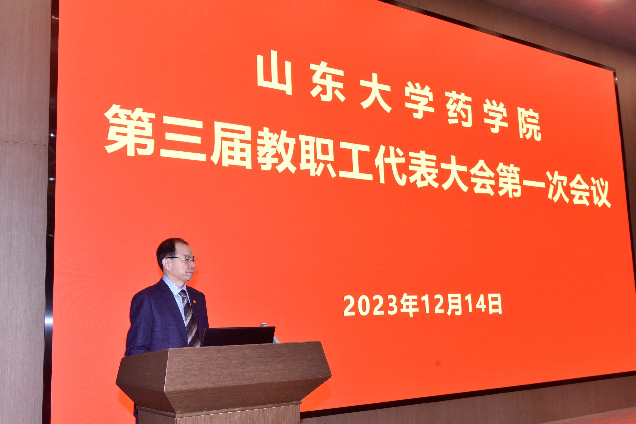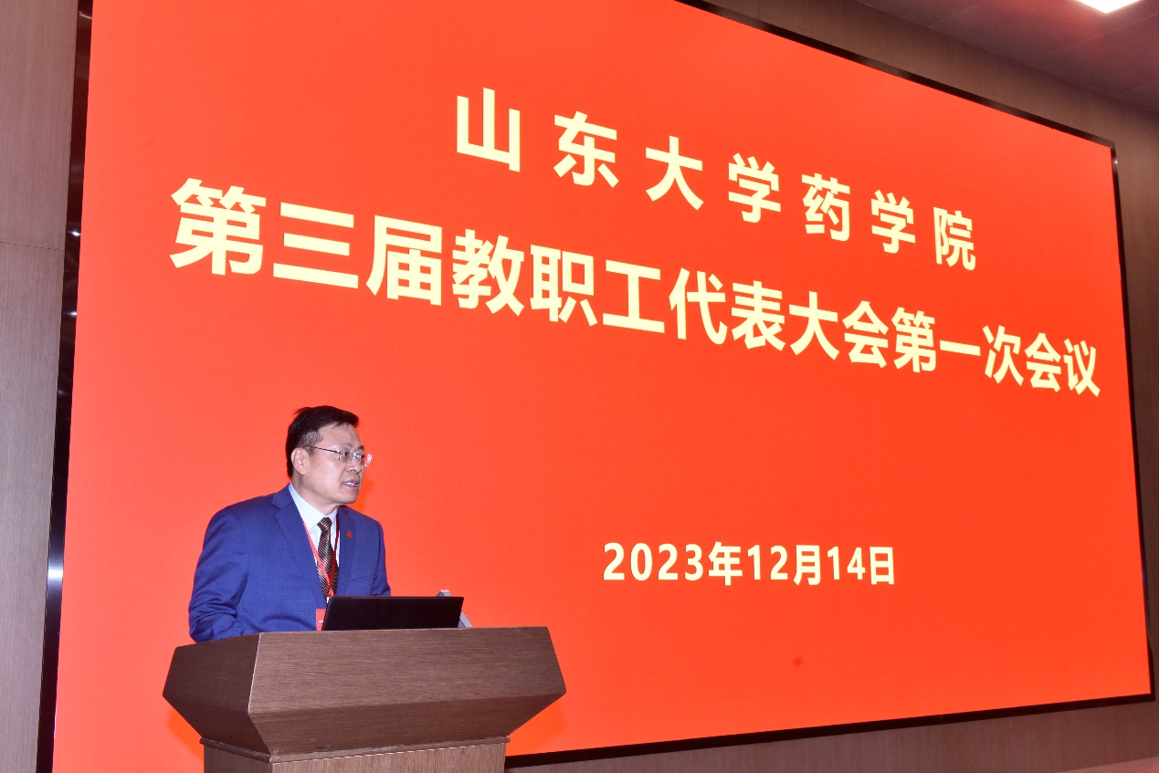王秋生指出,要以此次教代会为契机,凝心聚力,砥砺攻坚,团结带领全体教职工进一步把思想和行动统一到党的二十大的战略部署上来,把智慧和力量集聚到学校“全面图强”的新坐标上来,把个人发展的“小我”融入到学院事业发展的“大我”中来,不断增强心怀“国之大者”,建设世界一流大学的责任感、使命感、紧迫感,自信自强、团结一心,真抓实干、开拓创新,为学校加快建设担当中华民族复兴大任世界一流大学作出药院贡献。他代表学院党委提出三点希望:一是高举旗帜,把握正确政治方向。要把学习成效转化为实干担当、拼搏奋进的强大动力,团结动员学院师生坚定不移听党话、矢志不渝跟党走,为实现学院高质量发展目标不懈奋斗。二是凝心聚力,汇聚强大奋进合力。强院兴校,必须充分依靠全体教职工,调动全院师生的积极性、主动性、创造性,组织动员广大教职工立足岗位创新创造、发挥主力军、国家队作用,为民族复兴、强国建设,为强校兴国、强院兴校贡献智慧和力量。要始终站稳人民立场,践行党的群众路线,深入调查研究,及时了解教职工所思所想所盼,不断增强服务意识和服务本领,提升教职工幸福感、归属感、安全感、获得感。三是真抓实干,书写新的奋斗篇章。我们一代代药学人靠实干创造了学院辉煌的历史,我们还要靠实干开创更加美好的未来。要锚定奋进新征程的时代坐标,以更加饱满的热情、更加顽强的奋斗、更加智慧的创造,全身心投入学院各项事业发展、民族复兴伟业,以实干书写属于药院人新的奋斗篇章。努力回答好“教育强国山大何为、药院何为”的时代答卷。