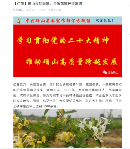 一是充分挖掘帮扶县资源禀赋,助力乡村经济建设。米乐·M6(China)官方网站准确把握乡村振兴新规律、新目标,积极对接确山县瓦岗镇帮扶需求,持续在激发帮扶地区内生动力、推动产业兴旺发展等方面下功夫。学院以温学森教授为代表的专家团队,深入分析当地土壤和气候特点,结合瓦岗镇中药材方面的资源优势,积极利用智库优势助力当地政府努力打破本地中药材种植品类桎梏,建议引进“北花一号”金银花优质品种在各村推广种植,目前全镇种植面积已达到1200余亩,实现了村集体经济发展的巨大突破。