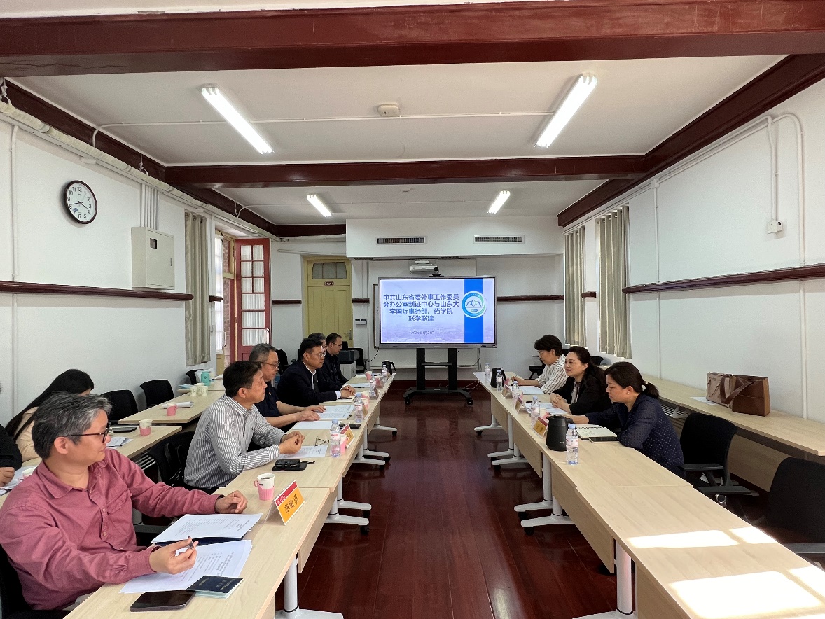 4月24日下午,米乐·M6(China)官方网站与中共山东省委外事工作委员会办公室制证中心、学校国际事务部开展联学联建活动。省委外办制证中心主任刘燕,学校国际事务部部长徐希锋,米乐·M6(China)官方网站党委书记王秋生、常务副院长方浩,山东省新药设计与创新药物研究重点实验室主任刘新泳等出席活动。