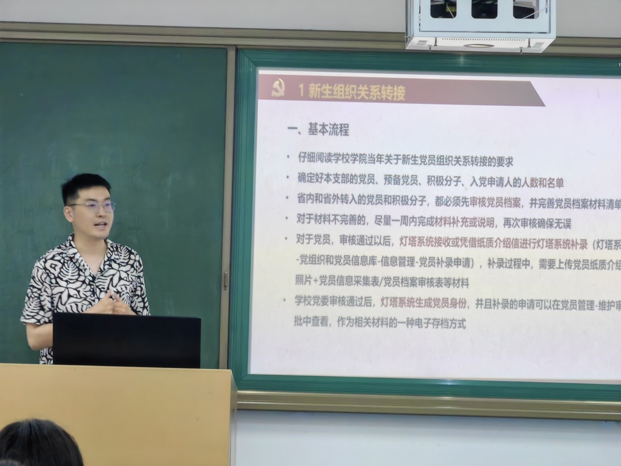 研究生一年级第一党支部副书记刘金虎围绕“如何做好组织关系转接”进行深入讲解。他还分享了如何根据支部实际情况制定切实可行的“三会一课”计划,以及如何确保每次活动的质量和效果。他指出,各支部要充分利用“三会一课”这个平台,加强党员之间的交流和学习,提高支部的凝聚力和战斗力。
