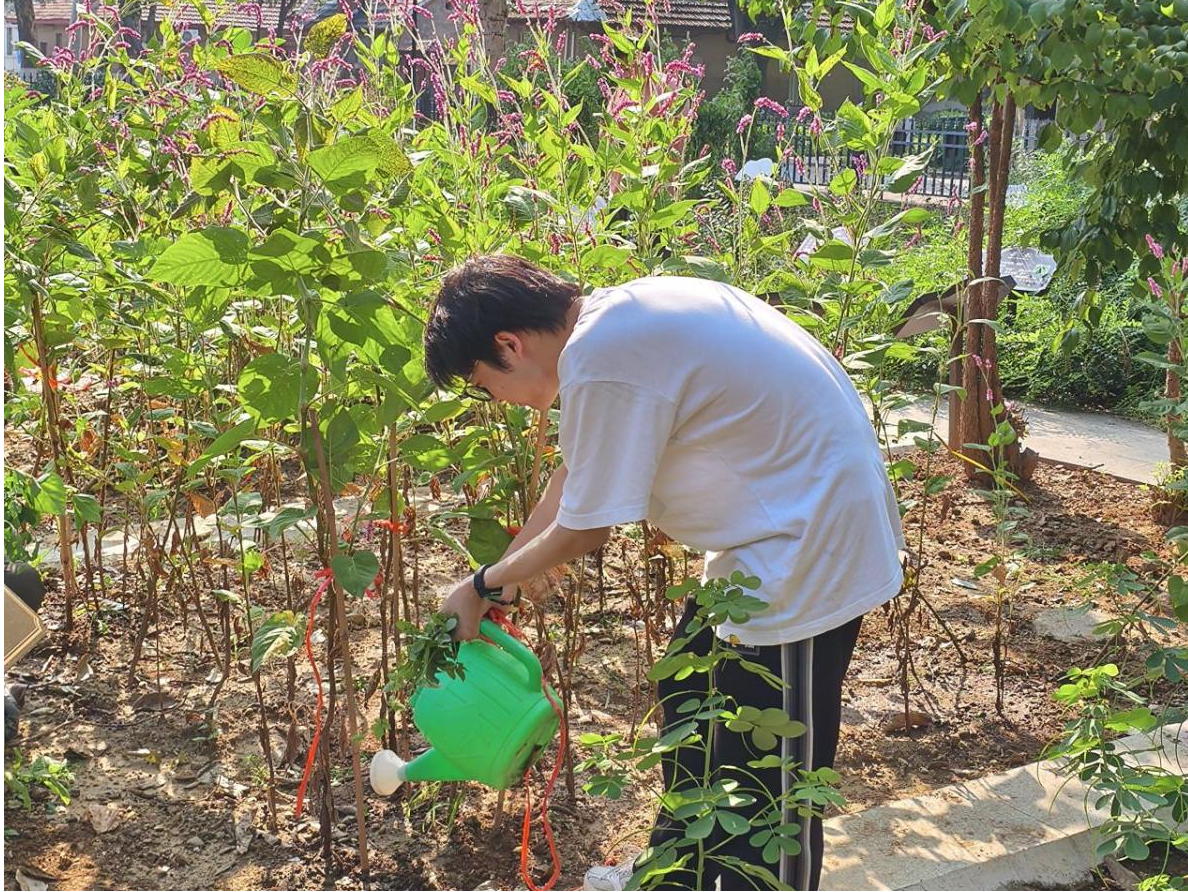 2022级本科生王运搏正在“中药百草园”中为药用植物学红蓼浇水,在劳动实践中了解药用植物特性,丰富中草药专业知识。