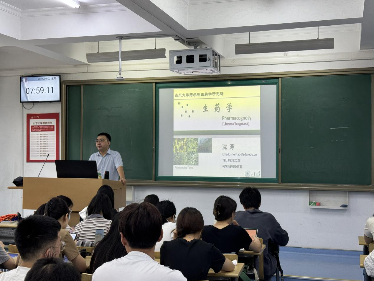 生药学研究所沈涛教授为本科生讲授生药学课程。同学们仔细聆听、认真思考。