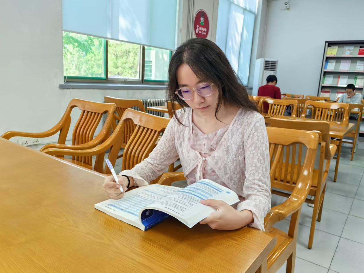 重返校园第一天,2023级本科生刘懿瑄来到图书馆预习新课程,以积极昂扬的面貌迎接新学期。