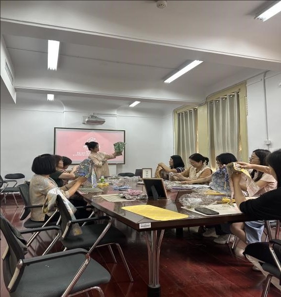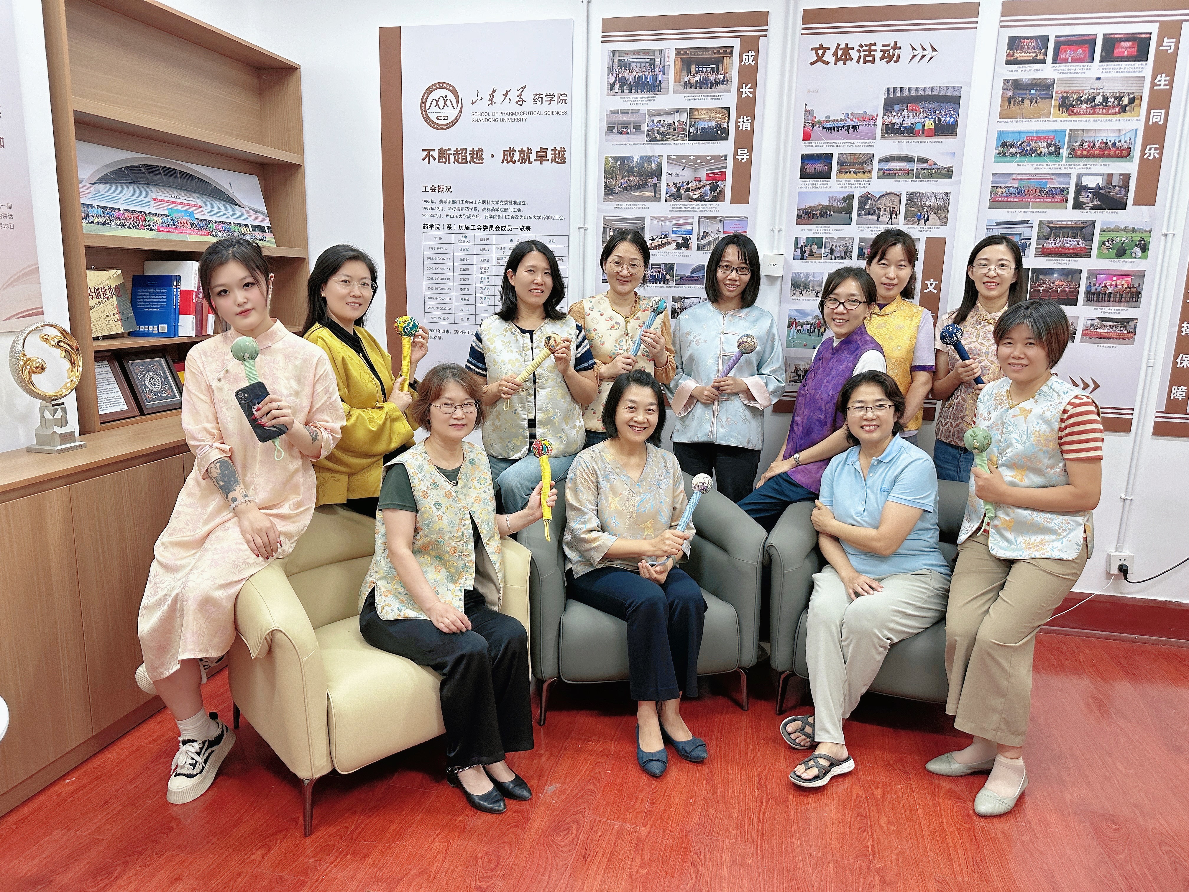 体验环节,大家身着新中式服装,加深了对中国传统非遗面料如香云纱、漳绒缎、宋锦以及各种传统纹样的认识,感受传统文化与现代时尚的融合碰撞,体悟中华传统文化的传承与创新。手作环节,老师们亲手用艾草制作艾草捶,纷纷结合药学专业分享自身对于中华传统文化的独到见解,传递了中华民族的文化自信。