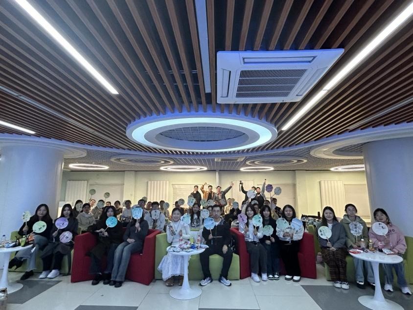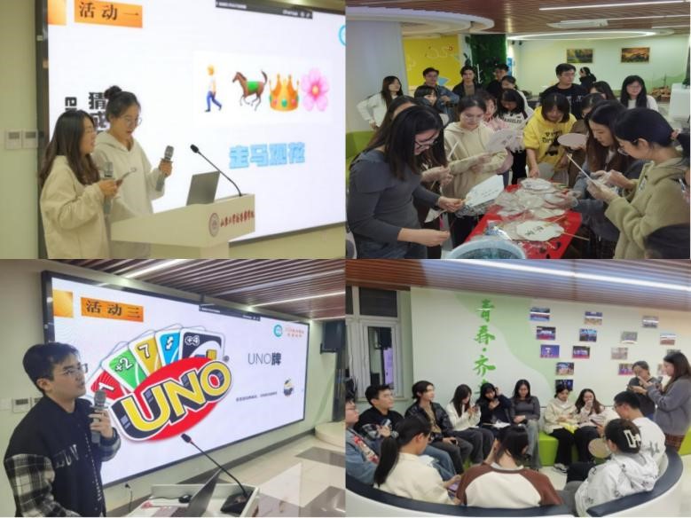 游戏环节是本次团建活动的重头戏,不仅考验了同学们的智力与体力,更让大家在轻松愉快的氛围中加深对彼此的了解。在“emoji猜成语”游戏中,同学们纷纷开动脑筋,抢答激烈,两支队伍凭借出色的表现赢得了“最强大脑奖”。“手工DIY”环节,大家一同体验了非遗文化漆扇的制作,感受传统文化的魅力。“UNO局”、“狼人杀”和“听歌识曲”等益智游戏也深受同学们喜爱。活动过程中,同学们积极热身,配合默契,每一次游戏比拼都充满了挑战与欢乐,也让大家更加珍惜彼此之间的友谊与团队协作的力量。