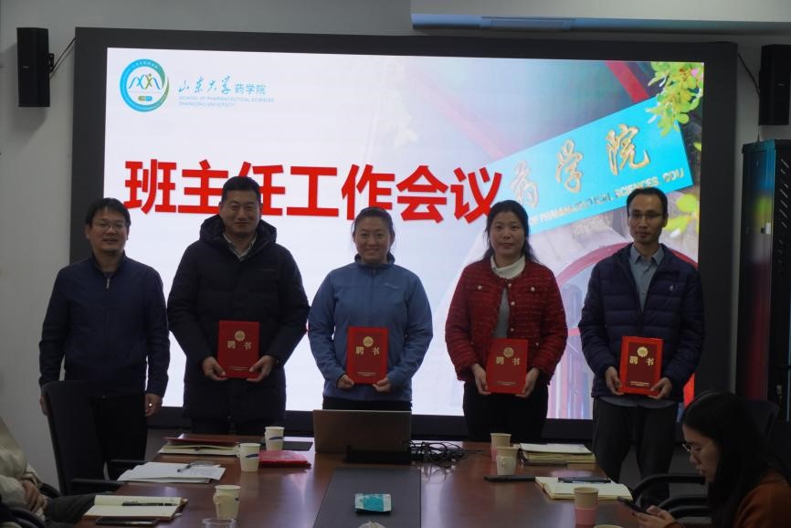 王小宁向杨斐、李慧、乔学志、郝国祥四位新聘班主任颁发聘书并做总结发言。他指出,班主任要深入开展药学专业素养教育,努力培养学生对药学专业的学习热情,指导学生做好学涯、职涯和生涯规划,培养创新创业意识,提高就业核心竞争力。