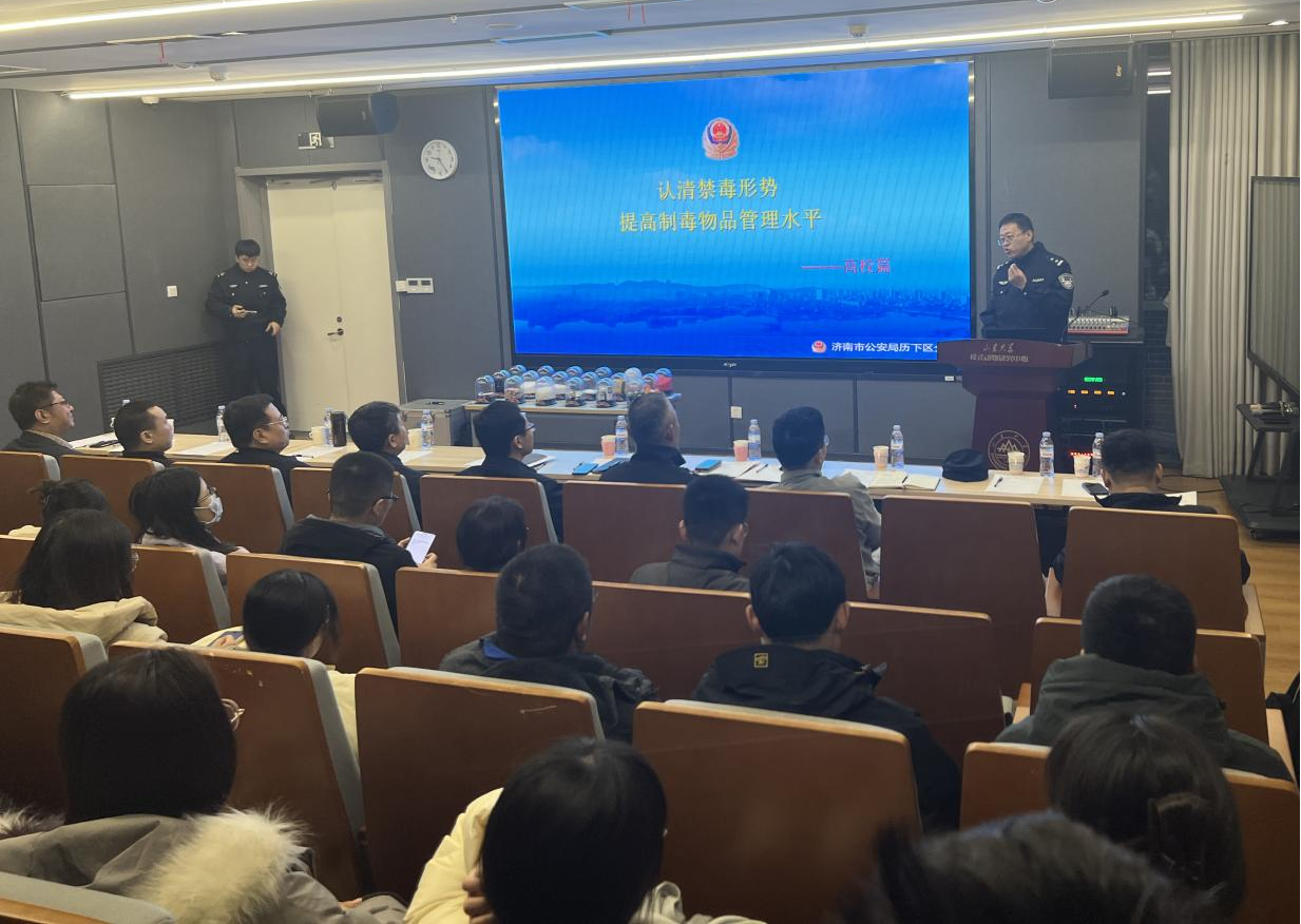 为进一步做好安全教育工作,深入开展禁毒宣传教育工作,增强师生识毒、防毒、拒毒和禁毒意识,12月3日上午,在模式动物中心报告厅开展了以“认清禁毒形势,提高制毒物品管理水平”为主题的宣传教育活动。活动由山东大学资产与实验室管理部主办、米乐·M6(China)官方网站承办,历下区公安分局副局长宁继勇、禁毒大队大队长傅其伟、禁毒大队一级警长马廷华,山东大学资产与实验室管理部副部长冉栋刚、米乐·M6(China)官方网站党委书记王秋生、党委保卫部副处长赵明晟等相关领导出席此次活动。会议由米乐·M6(China)官方网站副院长沈涛主持,学校各单位实验室安全管理员及师生代表参加会议。