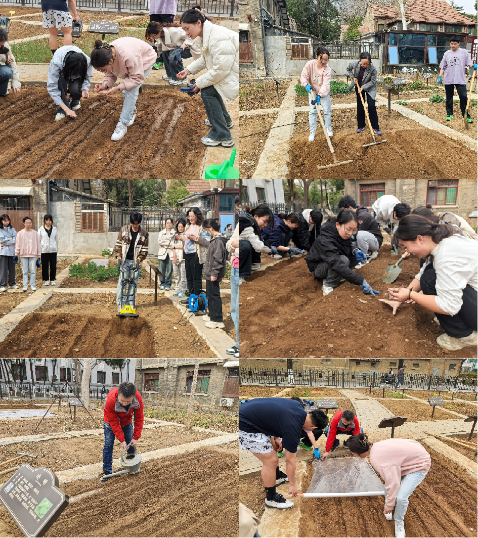 活动伊始,赵宇老师带领同学们了解中草药种苗的特性、种植要点和药用价值,手把手教授种植要求和注意事项。党员们按照规划区域,分组行动,挥舞锄头、铲子,翻土、起垄、铺平、播种、浇水、盖膜等工作各环节衔接有序。现场气氛热烈,大家干劲十足,在百草园的沃土中播种下春天的希望。