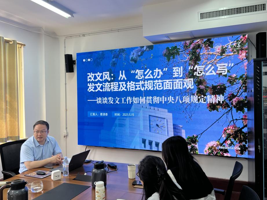 蔡清香以“改文风:从‘怎么办’到‘怎么写’发文流程及格式规范面面观”为题,结合中央八项规定精神和学校相关工作要求,介绍了公文的定义、发文工作流程、公文格式规范等内容。他结合典型案例梳理了公文写作中的常见错误,提供了相应的规范解析。他分享了公文写作的心得体会和经验技巧,鼓励大家多学、多写、多看、多改、多读,克服畏难心理,加强业务学习,锤炼文字能力,积累写作素材,培养严谨文风。