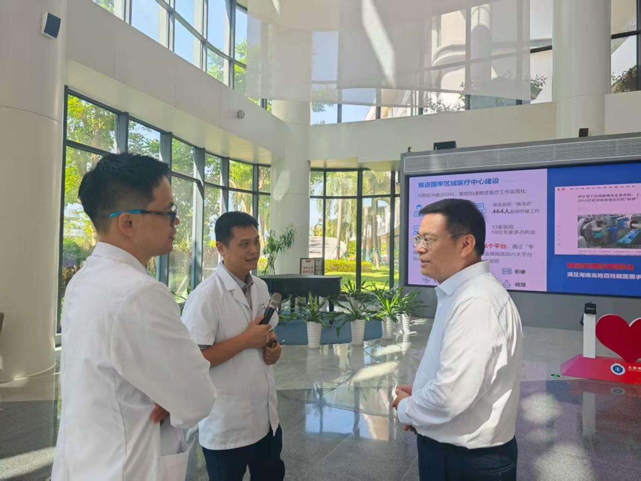 调研团队还访问了海口市人民医院,重点参观了国家药物临床试验机构。医院党委书记王会庆介绍了医院基本情况和学科特色,双方就药学人才需求和临床药学合作进行了探讨交流。市卫健委主任高新谱陪同调研。