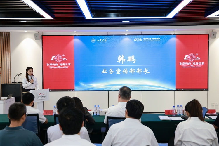 学员代表、鲁南制药业务宣传部部长韩鹏发言。她表示将珍惜机会认真学习,努力锻造成为兼具专业深度与岗位要求相结合的复合型人才,让沂蒙精神的红色基因与药学的科学基因在新时代交融生辉。