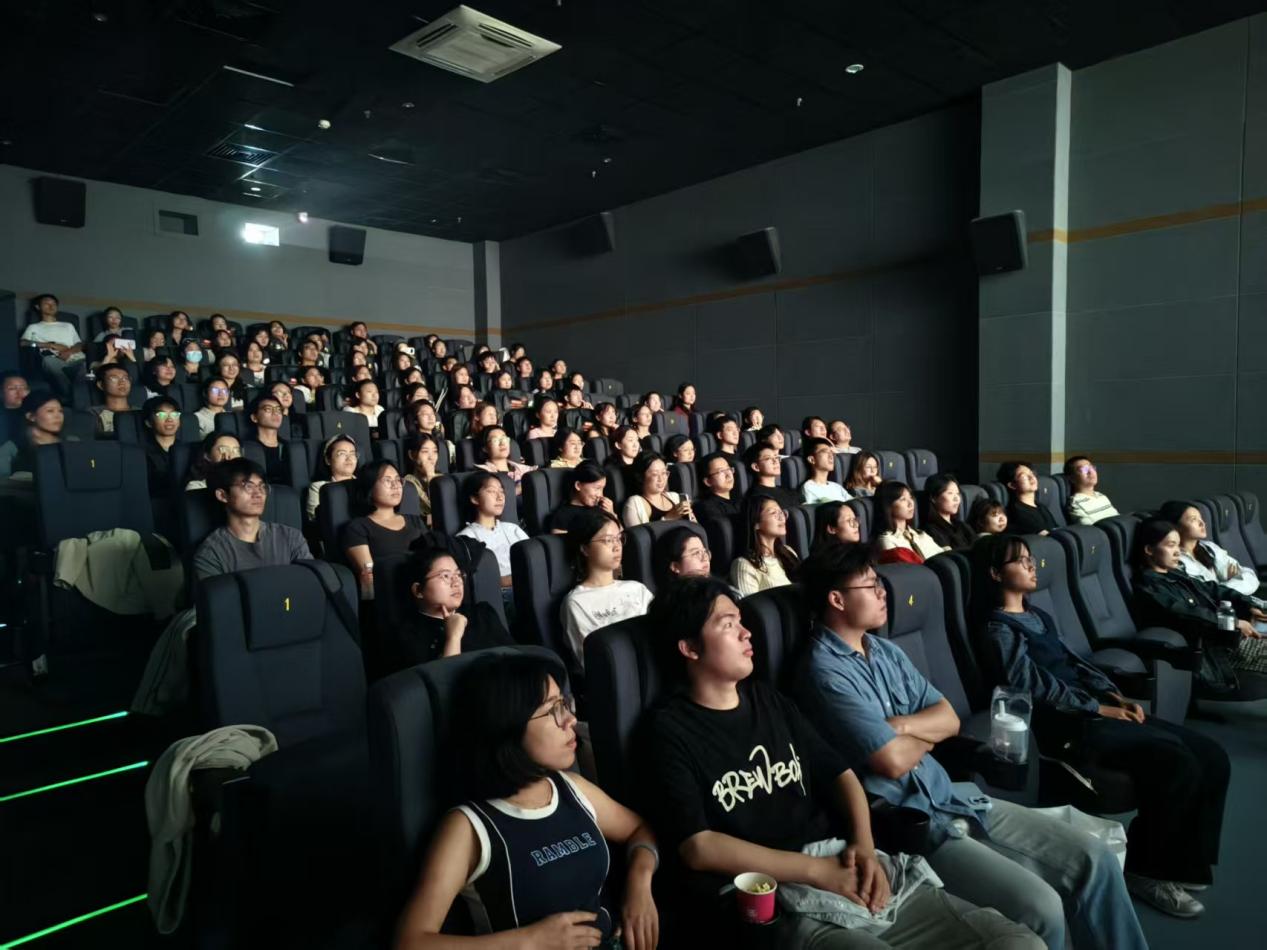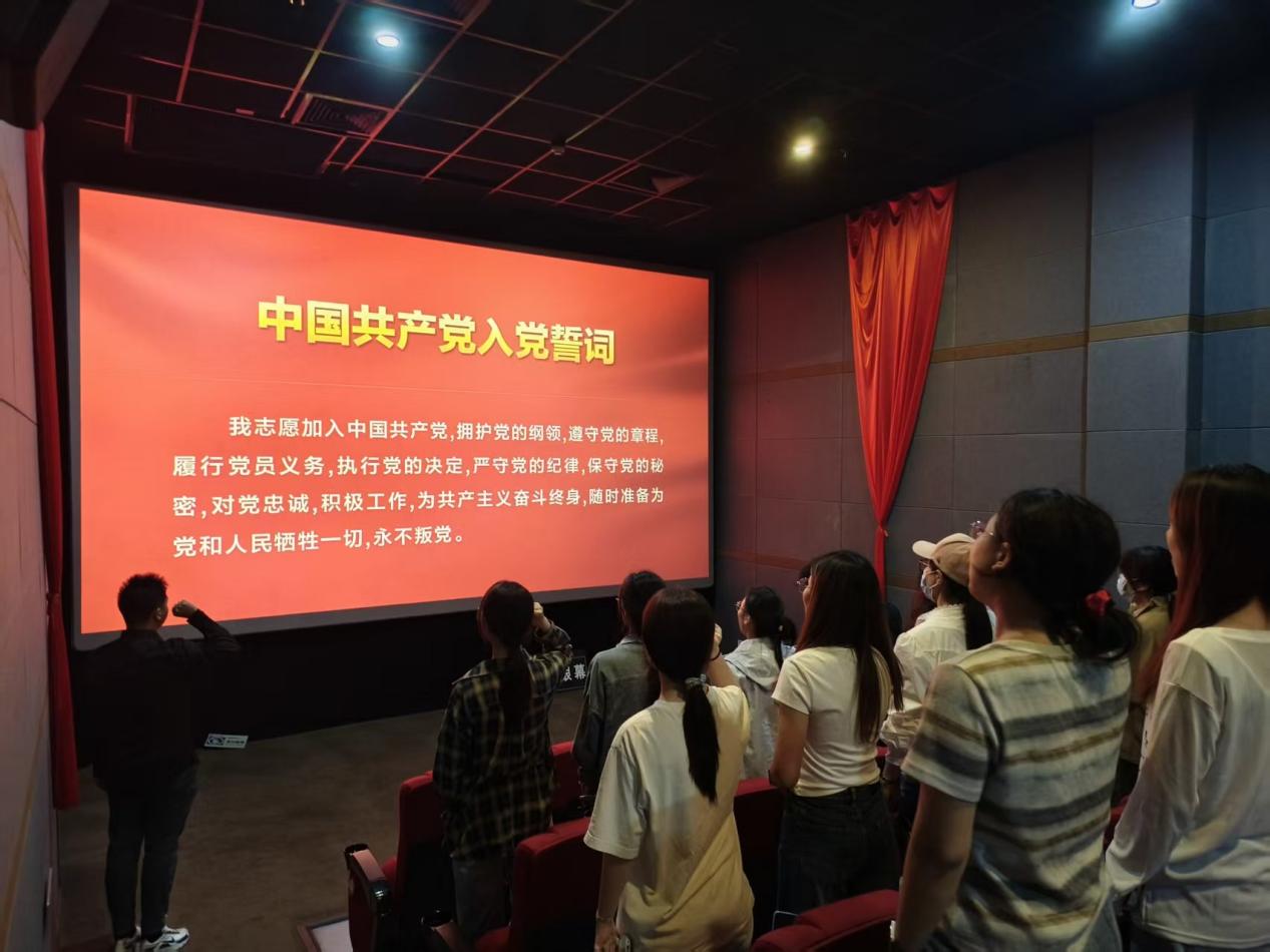 在观影前,研究生第二党支部和第八党支部精心组织全体党员同志重温入党誓词。在领誓人的带领下,党员们身姿挺拔,庄严肃立,高举右拳,郑重宣誓。现场党员们再次重温了入党时的庄严时刻,坚定了心中的信念,进一步强化了身为共产党员的责任感与使命感。