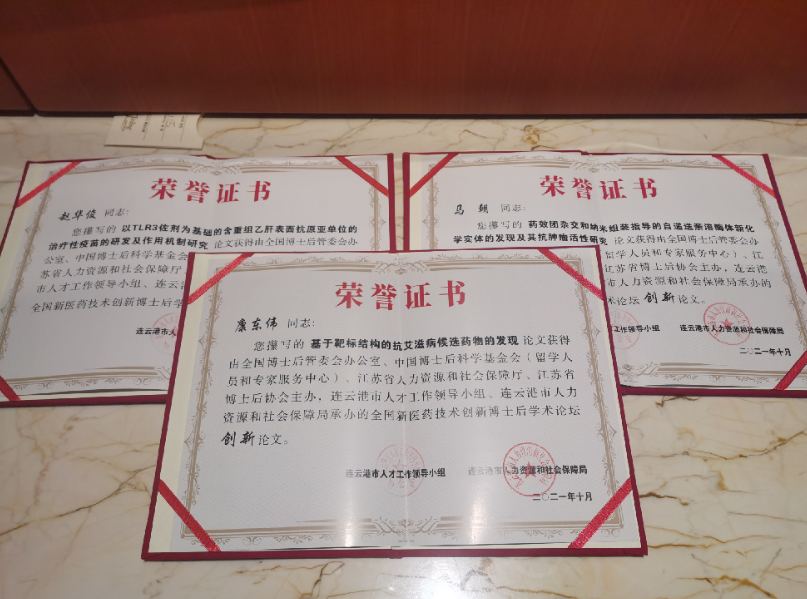 此次学术交流活动以“新医药技术创新”为主体,采取特邀院士主旨发言、参观考察等形式,结合全国以及连云港市医药创新发展情况进行学术交流和讨论。我院获奖论文为,赵华俊撰写的“以TLR3佐剂为基础的含重组乙肝表面抗原亚单位的治疗性疫苗的研发及作用机制研究”;马朝撰写的“药效团杂交和纳米组装指导的自递送亲溶酶体新化学实体的发现及其抗肿瘤活性研究”;康东伟撰写的“基于靶标结构的抗艾滋病候选药物的发现”,论文已收录至《2021年全国新医药技术创新博士后学术论坛论文集》。