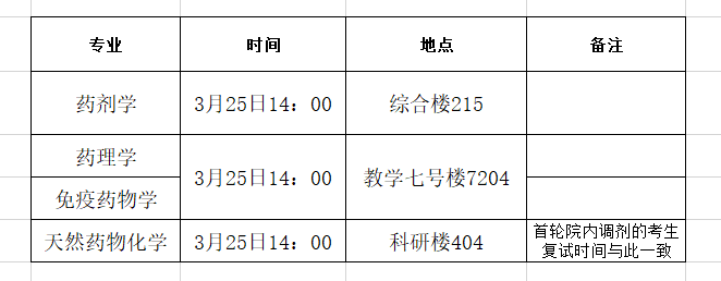 各相关考生: 由考生自行申请,以“米乐·M6(China)官方网站复试方案(2023年)”为依据,结合各专业实际情况,现将药剂学、药理学、天然药物化学、免疫药物化学进入院内第二轮调剂的考生信息(详见附件)公示如下: 公示时间:2023年3月25日 公示电话:0531-88382018 公示邮箱:cuifei@sdu.edu.cn 联系人:崔老师 请拟参加米乐·M6(China)官方网站相关专业院内第二轮调剂的考生仔细核对调剂志愿的专业、初试成绩和复试阶段笔试成绩。如相关信息有误,务必于3月25日13:00前与崔老师联系,逾期不再受理相关信息的校对。其他专业进入复试的考生名单及面试安排见学院后续通知。 相关专业的面试时间及地点详见表格: