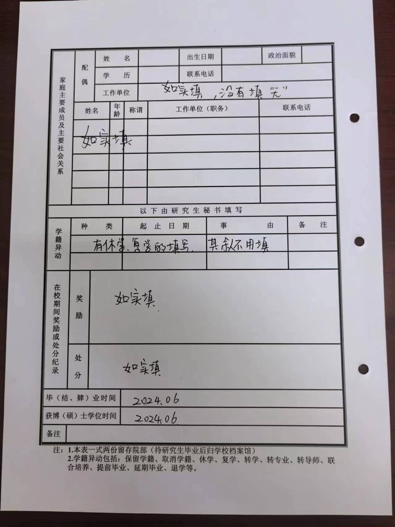 三、整理学籍档案 (1)研究生学籍卡1份(示例见下图)、成绩单(中)1份、毕业审批表1份